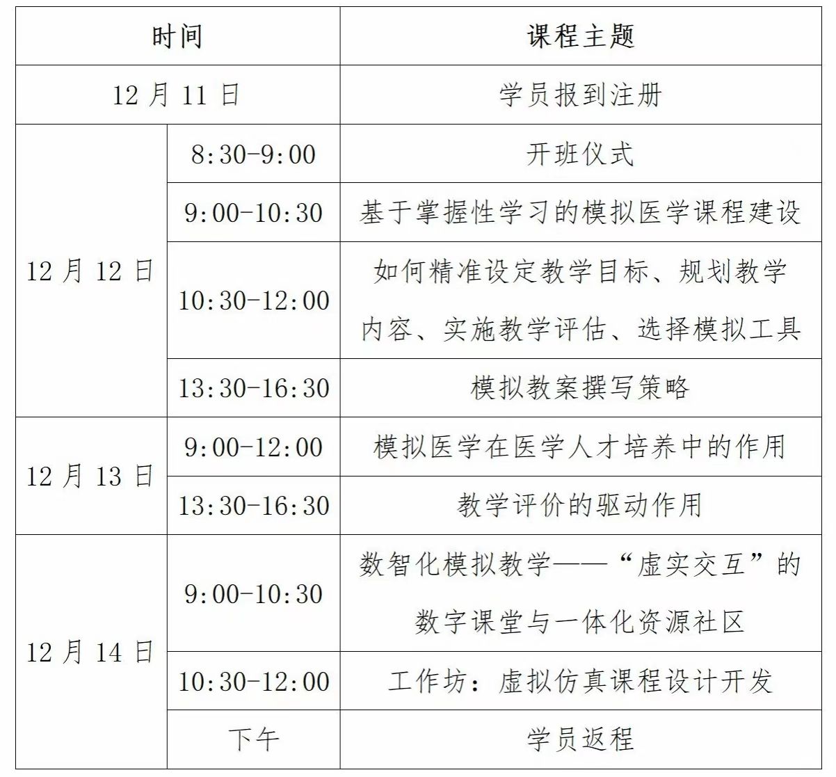 本次培训围绕“技术赋能教育、模拟重塑临床”的核心理念,以人文关怀、创新实践为导向,围绕医学模拟教学全流程体系,帮助学员系统掌握模拟教学的核心方法论,为新医科背景下医学人才培养模式改革提供师资保障。现将有关事项通知如下: