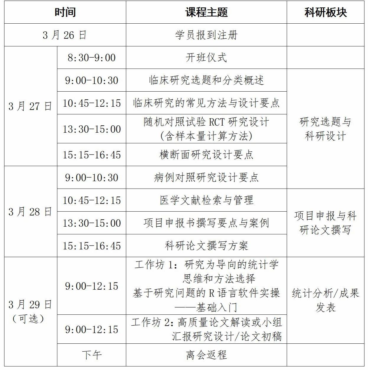 临床科研全流程专题讲座与研讨,采用专题讲座的形式授课(可选参加工作坊,工作坊1形式为统计方法和R语言实操,工作坊2形式为研究方案及论文初稿研讨,工作坊配备专职带教导师,共同完成统计学案例分析实操或针对研究计划及论文初稿进行专业指导)。