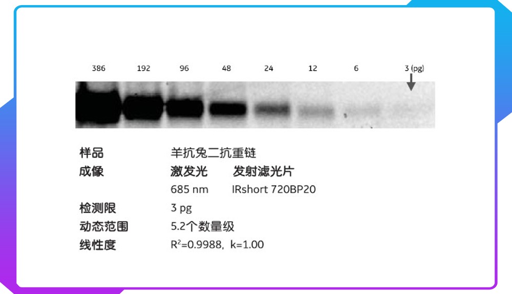 二抗按两倍倍比稀释,用Amersham Typhoon成像,箭头所指为检测限。检测限为3pg且线性动态范围为5.2个数量