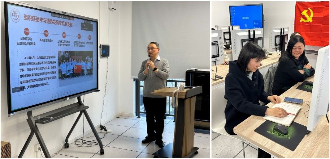 为贯彻党委高质量党建引领高质量学科发展的学科建设思路,2025年12月24日下午,上海交通大学基础医学院组织胚胎学与遗传发育学系党支部在基础医学院建院70周年之际,联合基础医学院解剖学与生理学系党支部,在浦东新校区生命科学馆,成功主办了“AI赋能下的组织胚胎学与解剖教科研新模态”主题党日活动。基础医学院党委书记童雪梅,生殖教学团队首席教师伍静文副教授,泌尿教学团队的夏小雨副教授,研究生第二党支部的党员代表出席活动。同时,党支部邀请对口联建的遵义医科大学基础医学院、宁夏医科大学基础医学院的组织胚胎学党支部和解剖学党支部,通过线上分会场共同参与交流。活动由组织胚胎学与遗传发育学系党支部书记张明亮研究员主持。