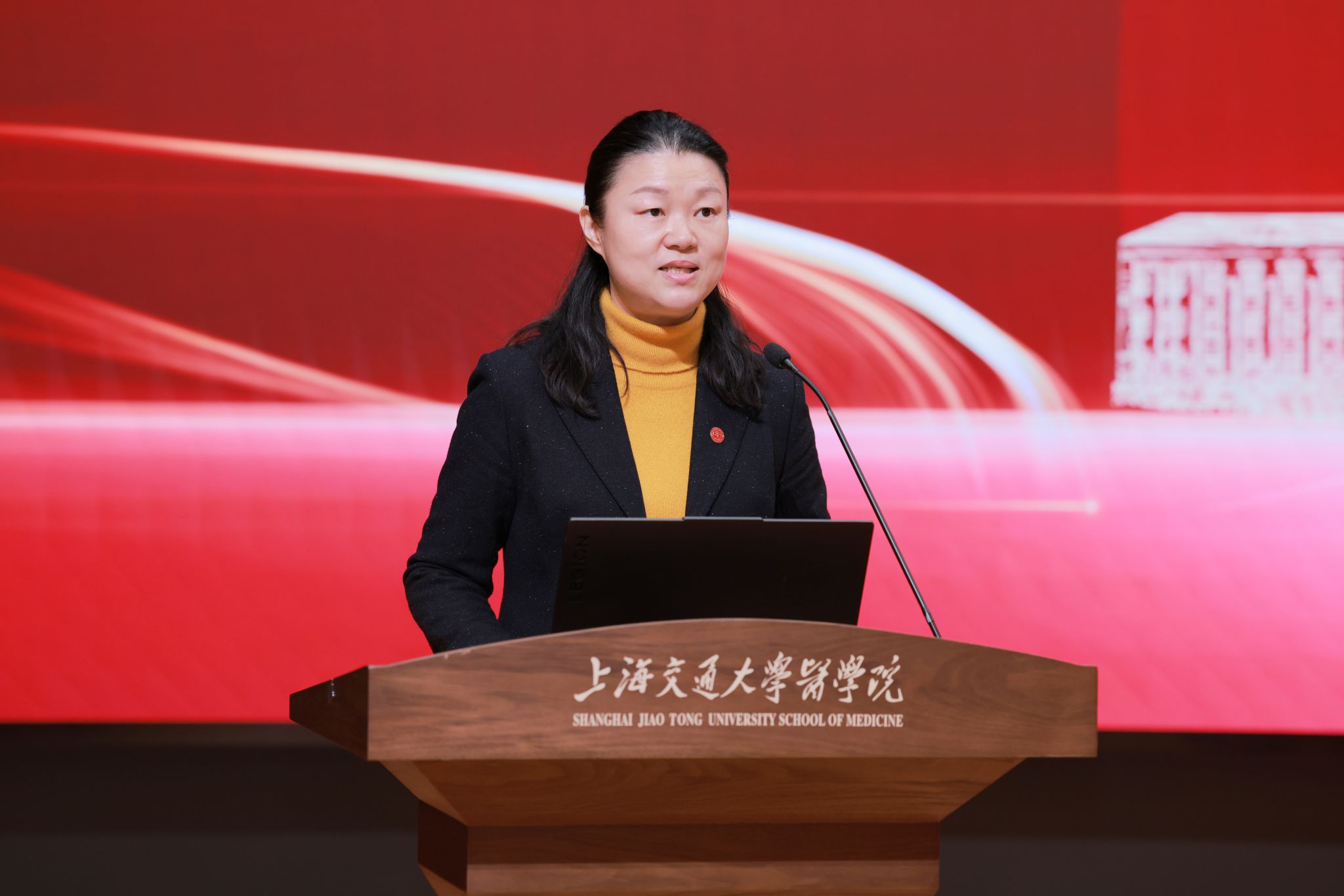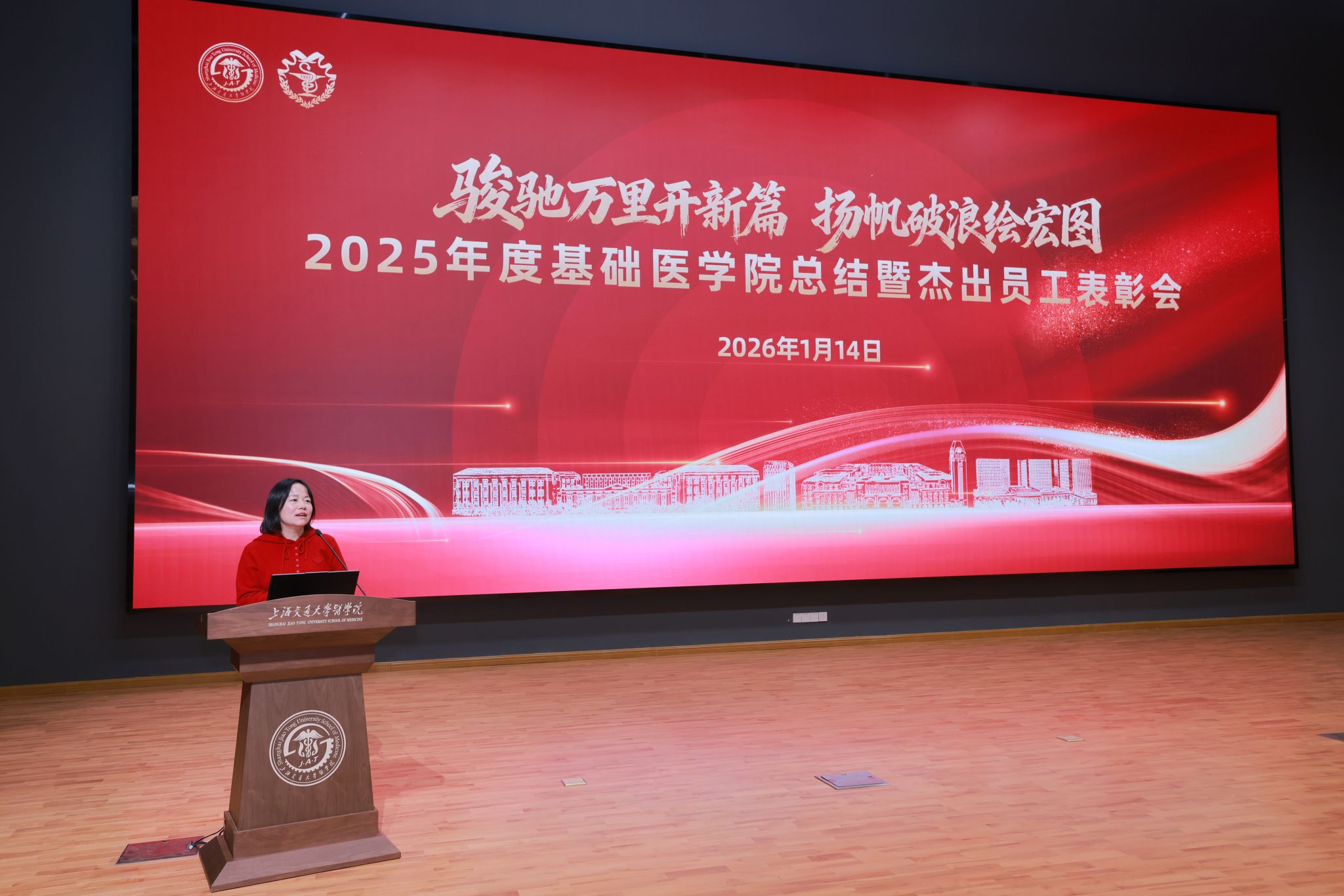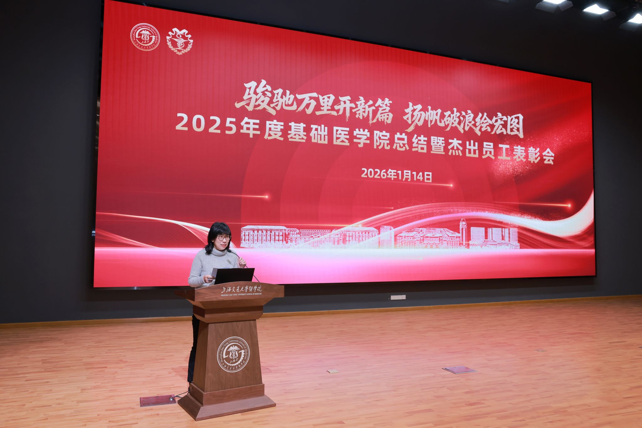 大会在庄严的国歌声中拉开帷幕。毕宇芳首先致辞。她代表医学院向基础医学院过去一年取得的优异成绩表示热烈祝贺,向长期奋战在基础医学教育教学与科学研究一线的全体教职员工表示衷心感谢。她指出,基础医学院刚刚度过建院70周年华诞,作为医学院历史最为悠久、规模最大的二级学院,在推动医学院“双一流”建设征程中发挥着举足轻重的作用。2025年基础医学院在领导班子与全体师生教职员工的共同努力下,历尽艰辛、攻坚克难,顺利圆满地完成了浦东新校区的搬迁和正式启用。同时,也欣喜的看到,过去一年基础医学院在人才育引、教学改革、科研成果等方面取得了瞩目的成绩。站在浦东新校区,发展新起点上,毕宇芳对基础医学院建设提出三点希望:一是坚持立德树人根本,培养卓越医学创新人才。基础医学院作为重要的医学教育教学基地,必须牢牢把握“为党育人、为国育才”的初心使命,要以入选“立德树人机制综合改革上海市试点单位”为契机,持续推动基础医学课程创新发展,让最前沿的智能技术成果及时转化为育人资源,培养更多具有国际视野、创新精神和社会责任感的卓越医学创新人才。二是坚持AI交叉融合,构筑学科发展高峰。要发挥师生员工的主观能动性,聚焦“AI赋能、交叉创新”核心方向,引领医学教育与科学研究的新形态、新范式,构筑基础医学学科发展与人才培养的新高峰,为医学院“双一流”建设做出更大贡献。三是坚持文化铸魂育人,赋能学院高质量发展。要让沉淀70年的学院优秀文化基因和交医130年办学历程的精神文脉,真正转化为凝聚人心、滋养品格、激发创新的内生动力,为培养卓越医学人才、实现科技自立自强和促进学院高质量发展提供持久而强大的精神力量。