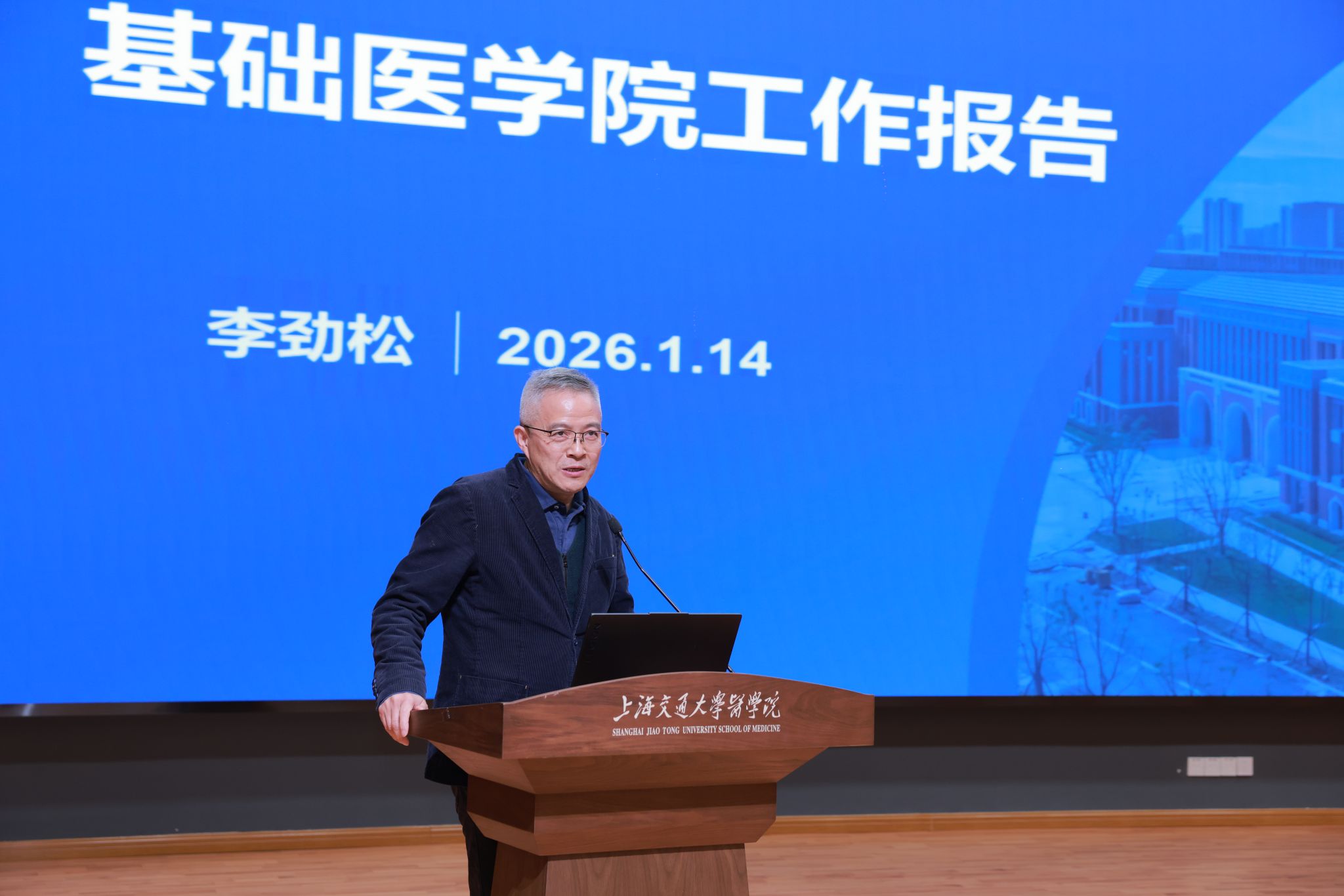 最后,基础医学院院长李劲松院士作学院年度工作报告。他对2025年学院工作进行了全面总结,对2026年的建设目标、发展规划做了展望。新的一年,基础医学院将在对接国家与上海市战略,对接医学院联动生命科学医药领域及医谷建设持续发力,谋划好“十五五”规划,坚持立德树人根本任务,进一步凝练学科方向,明确时间表、路线图、任务书,为医学院及基础医学院新一轮发展释放更有力的“大基础”力量。