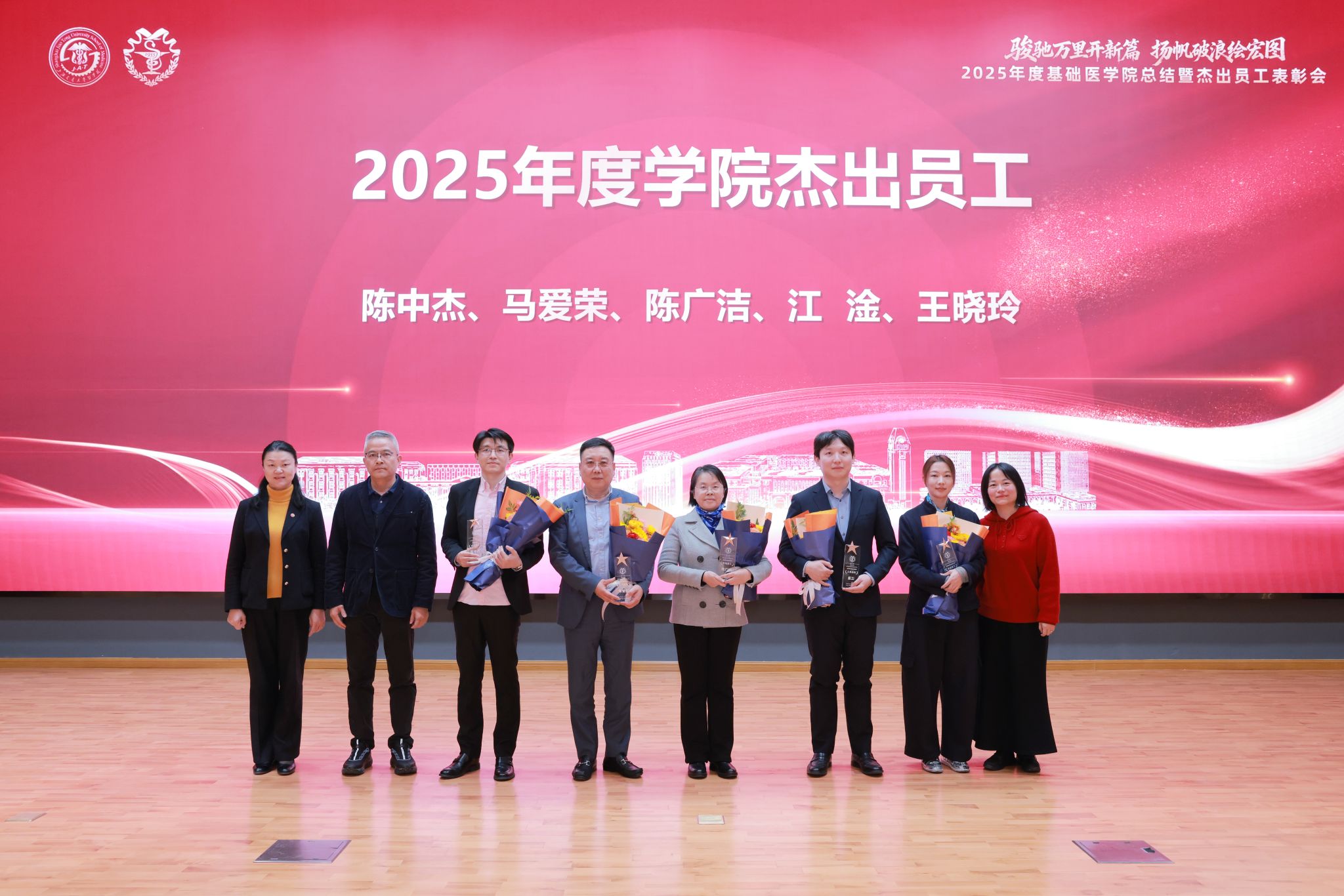 基础医学院2025年度“杰出员工”(左三起:陈中杰、马爱荣、陈广洁、江淦、王晓玲)