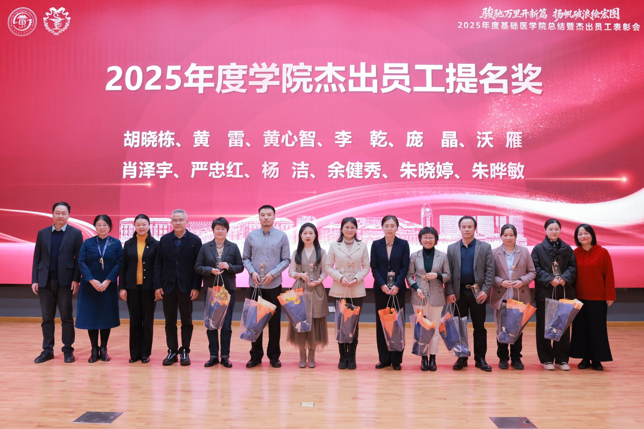 基础医学院2025年度“杰出员工提名奖”(左五起:黄心智、李乾、庞晶、沃雁、严忠红、杨洁、余健秀、朱晔敏、朱晓婷)