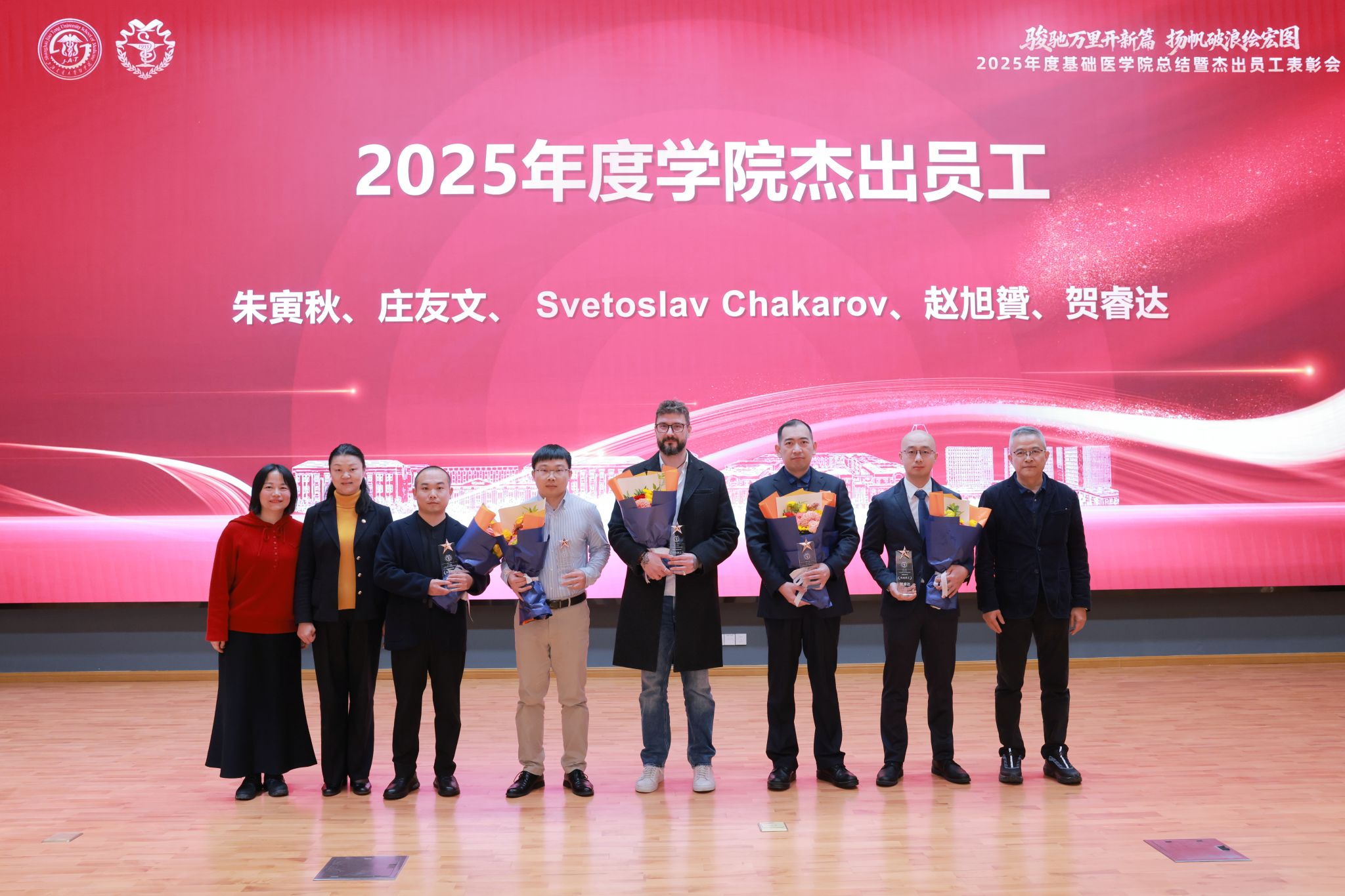 基础医学院2025年度“杰出员工”(左三起:朱寅秋、庄友文、Svet、赵旭赟、贺睿达)