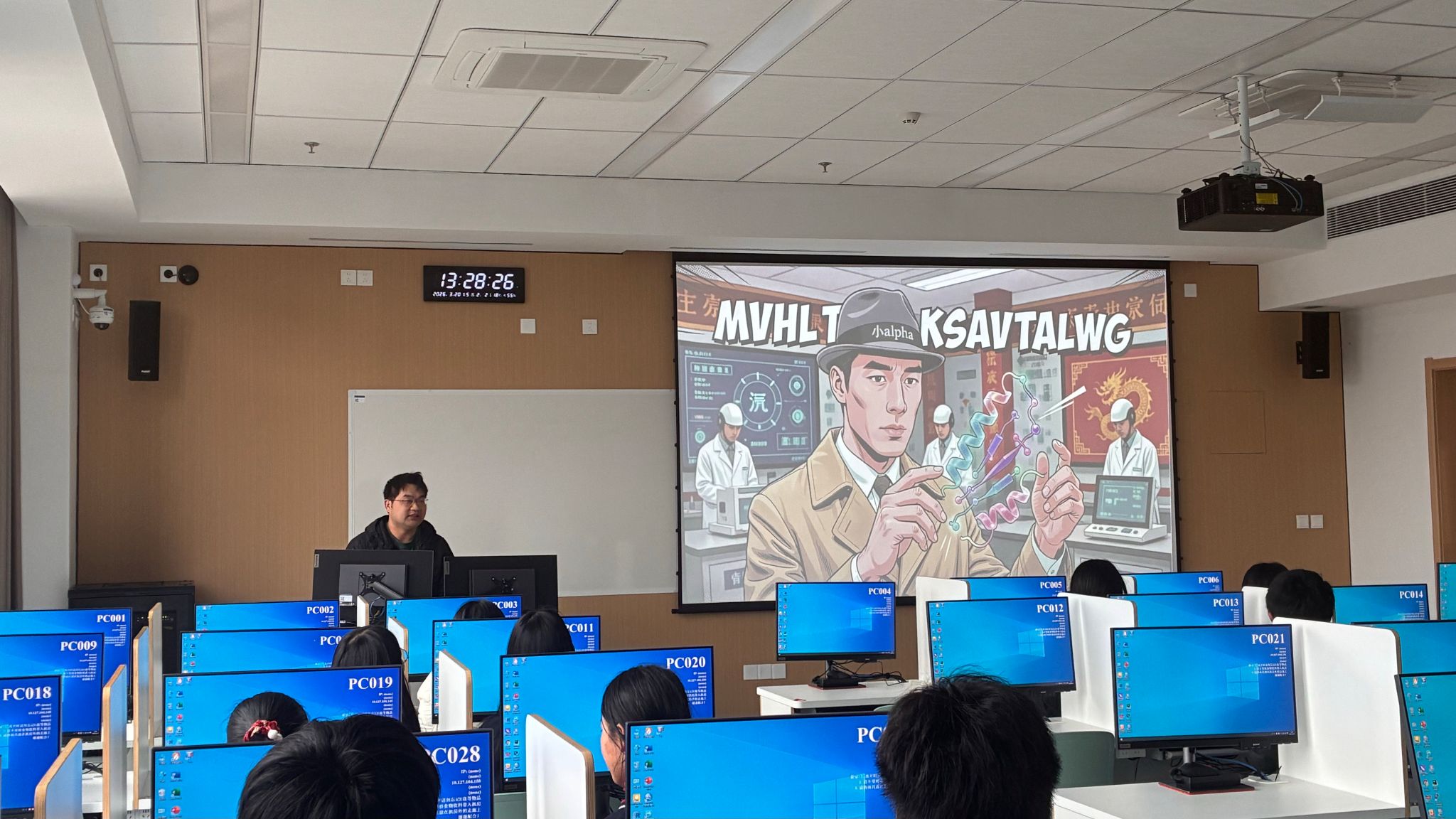 在多媒体计算教室内,黄建湘博士为同学们带来了一堂生动的“蛋白质结构AI预测:解锁生命的秘密积木”实践课。同学们在机房中亲手操作蛋白质结构预测工具,查看并旋转蛋白质的三维结构,从理论讲解到动手尝试,近距离感受人工智能在药物研发领域的应用魅力。