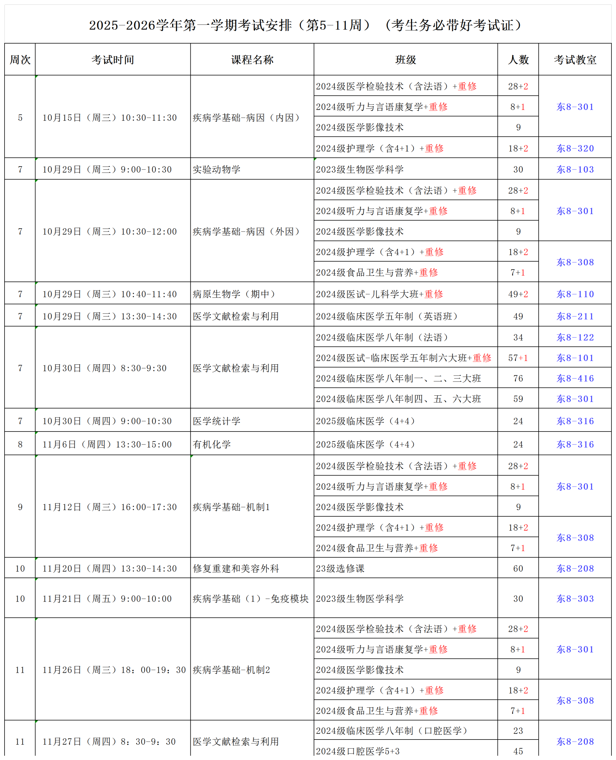 基础医学院2025-2026学年第一学期考试安排(第5-11周)