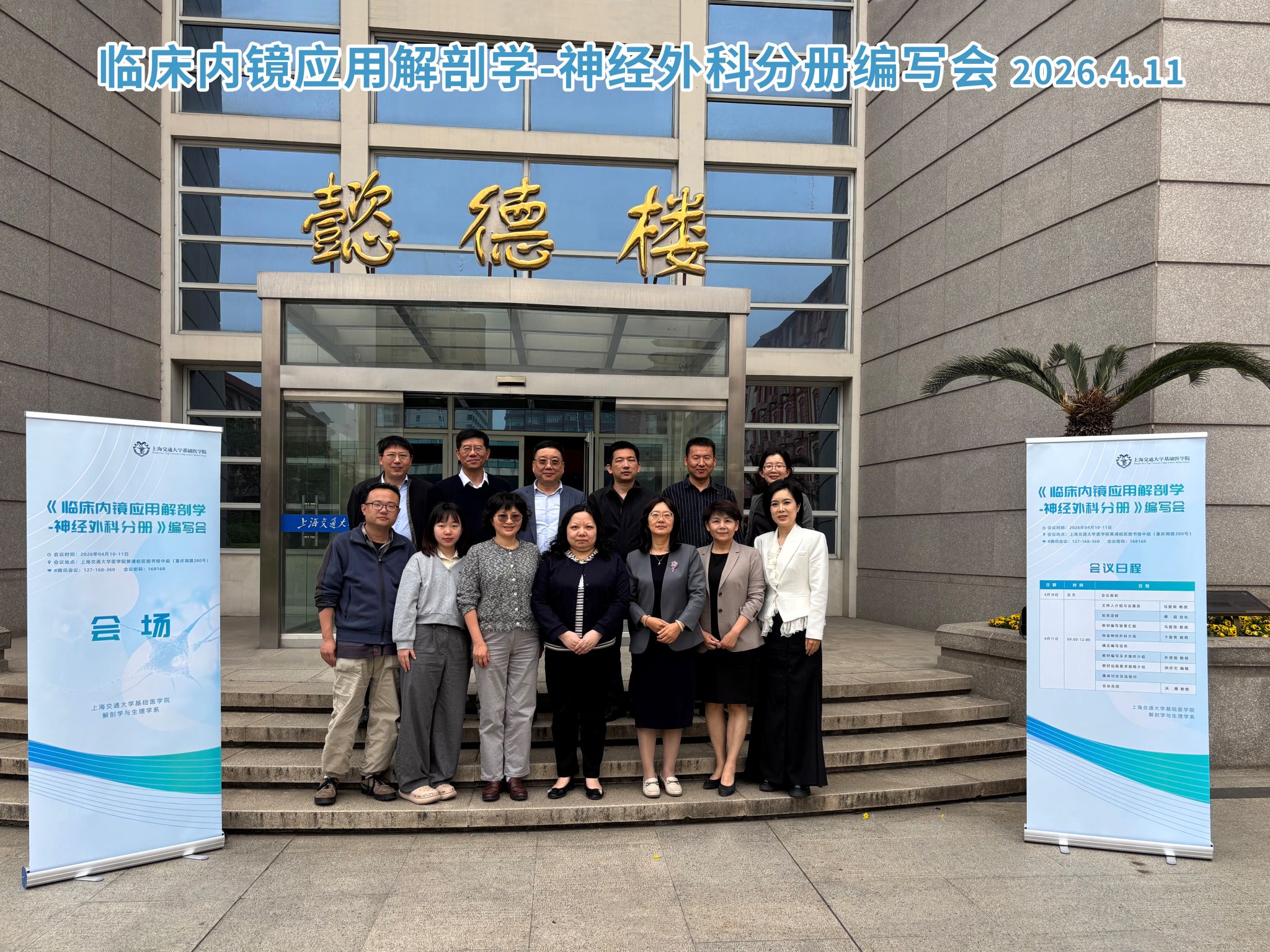 2026年4月11日,上海交通大学医学院解剖学与生理学系在上海交通大学医学院黄浦校区图书馆中庭召开了《临床内镜应用解剖学-神经外科分册》教材编写工作会议。本次会议汇聚来自上海交通大学医学院、瑞金医院、空军军医大学、南方医科大学、江南大学无锡医学院、郑州大学基础医学院等多所院校的知名专家和临床医生到会参加,河北医科大学、首都医科大学同仁在线上共同探讨教材编写工作。