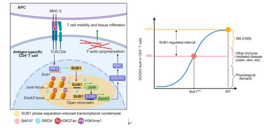基于前期临床数据的分析, 本研究团队发现SUB1在多种自身免疫病患者CD4⁺ T细胞中表达显著上调, 且其表达受TCR-IRF4信号轴直接调控。研究人员通过构建T细胞SUB1特异性敲除小鼠并诱导实验性自身免疫性脑脊髓炎 (EAE) ,发现SUB1缺失可完全防止EAE发病, 并显著减少CD4⁺ T细胞的中枢神经系统 (CNS) 浸润。进一步整合多组学分析表明, SUB1缺失导致关键迁移调节因子DOCK2表达下调,进而抑制Rac依赖的肌动蛋白聚合, 最终削弱T细胞的迁移能力。深入的分子机制研究揭示, SUB1可通过液-液相分离 (LLPS) 形成生物分子凝聚体以打开特定染色质区域, 进而直接反式激活Junb转录, 并与JUNB蛋白结合协同放大Dock2基因表达 (图1左)。
