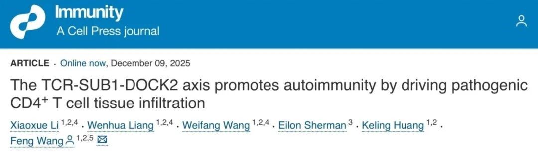 12月9日, 基础医学院王锋课题组在Immunity杂志在线发表了题为“The TCR-SUB1-DOCK2 Axis Promotes Autoimmunity by Driving Pathogenic CD4⁺ T Cell Tissue Infiltration”的研究论文。该研究系统阐明了TCR信号途径下游关键分子SUB1通过定量调控Dock2基因转录, 驱动炎性CD4⁺ T细胞向病变组织浸润,从而诱发自身免疫疾病的全新机制。研究揭示SUB1作为调控致病性CD4⁺ T细胞组织迁移的“分子守门人”, 为精准靶向免疫细胞迁移,治疗自身免疫疾病提供了潜在新策略。