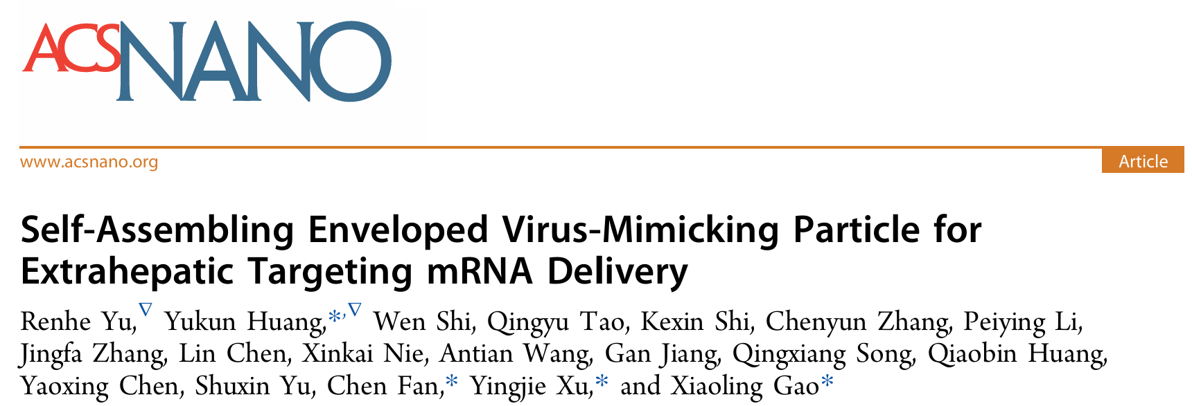 2026年4月,基础医学院高小玲教授课题组联合徐颖洁团队与樊晨团队在《ACS Nano》发表题为“Self-Assembling Enveloped Virus-Mimicking Particle for Extrahepatic Targeting mRNA Delivery”的研究论文。该研究借鉴包膜病毒的天然自组装与RNA转运模式,提出包膜病毒模拟颗粒(Enveloped Virus-Mimicking Particle, EVMP)的从头设计策略,构建出兼具安全性、高效性与肝外靶向能力的非病毒mRNA递送平台。EVMP的设计为仿生mRNA递送载体的后续开发及肝外mRNA疗法的临床拓展提供了新的思路。