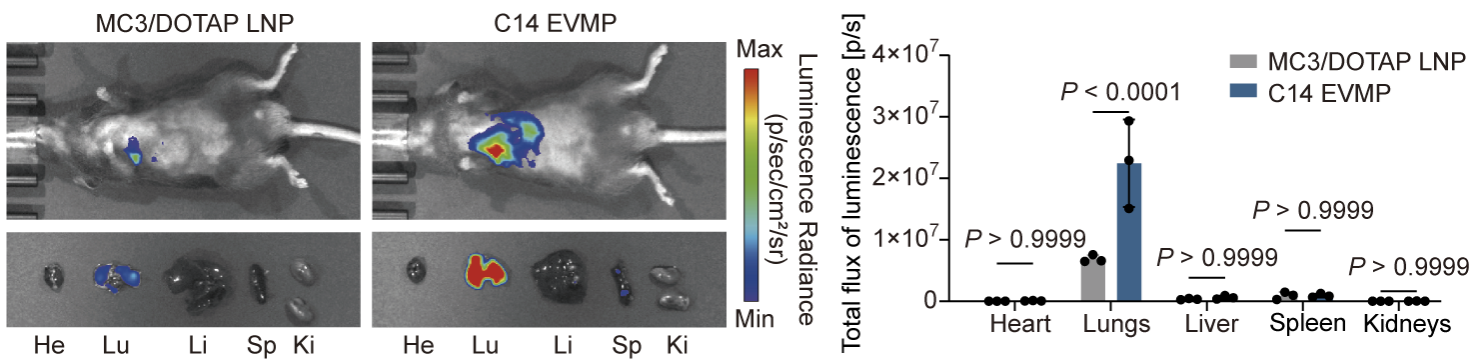 图2 肺靶向EVMP在肺部的转染效率显著高于MC3/DOTAP LNP