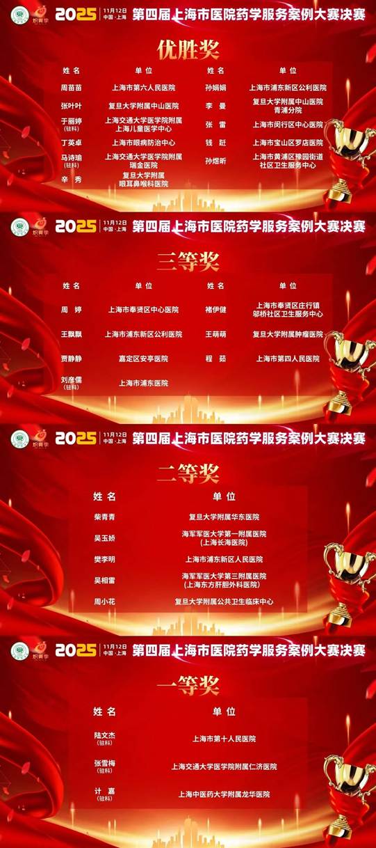 2025年11月12日,由上海市药学会医院药学专业委员会主办的2025年第四届上海市医院药学服务案例大赛决赛在上海市隆重召开,我院药学部临床药师张雪梅所汇报的案例《重症药学:如何实现标准框架下的个体化突破》荣获大赛一等奖。