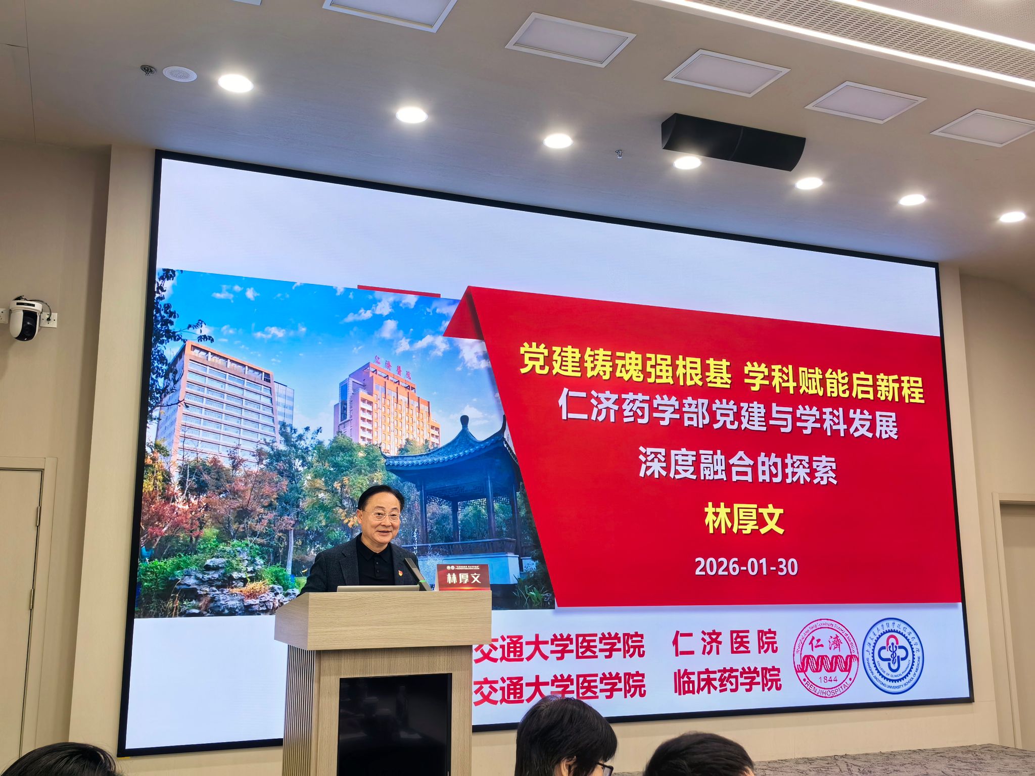 在主题分享环节,仁济医院药学部主任、党支部书记、上海交通大学医学院临床药学院院长林厚文以《党建铸魂强根基 学科赋能启新程——仁济药学部党建与学科发展》为题,系统介绍了“党建统领学科发展”的五大专项行动——“思政领航、创优争先、内涵深化、出群拔萃、共建联建”。他指出,通过将党的政治优势、组织优势转化为学科发展动能,仁济药学实现了服务能级与科研创新能力的双提升。在学科建设方面,仁济药学部聚焦研究型临床药师培养,构建抗凝、风湿病、抗感染等7大亚专业体系,学科竞争力连续多年位居上海市公立医院药剂系列首位。药剂科党支部先后入选2022年上海市公立医院党建工作“样板支部”创建单位、2024年全国公立医院临床科室标杆党支部;党建带团建成效显著,2022年被团中央授予“一星级全国青年文明号”,2023年被升级授予为“二星级全国青年文明号”,以党建引领药学事业高质量发展的实践路径,结出了累累硕果。