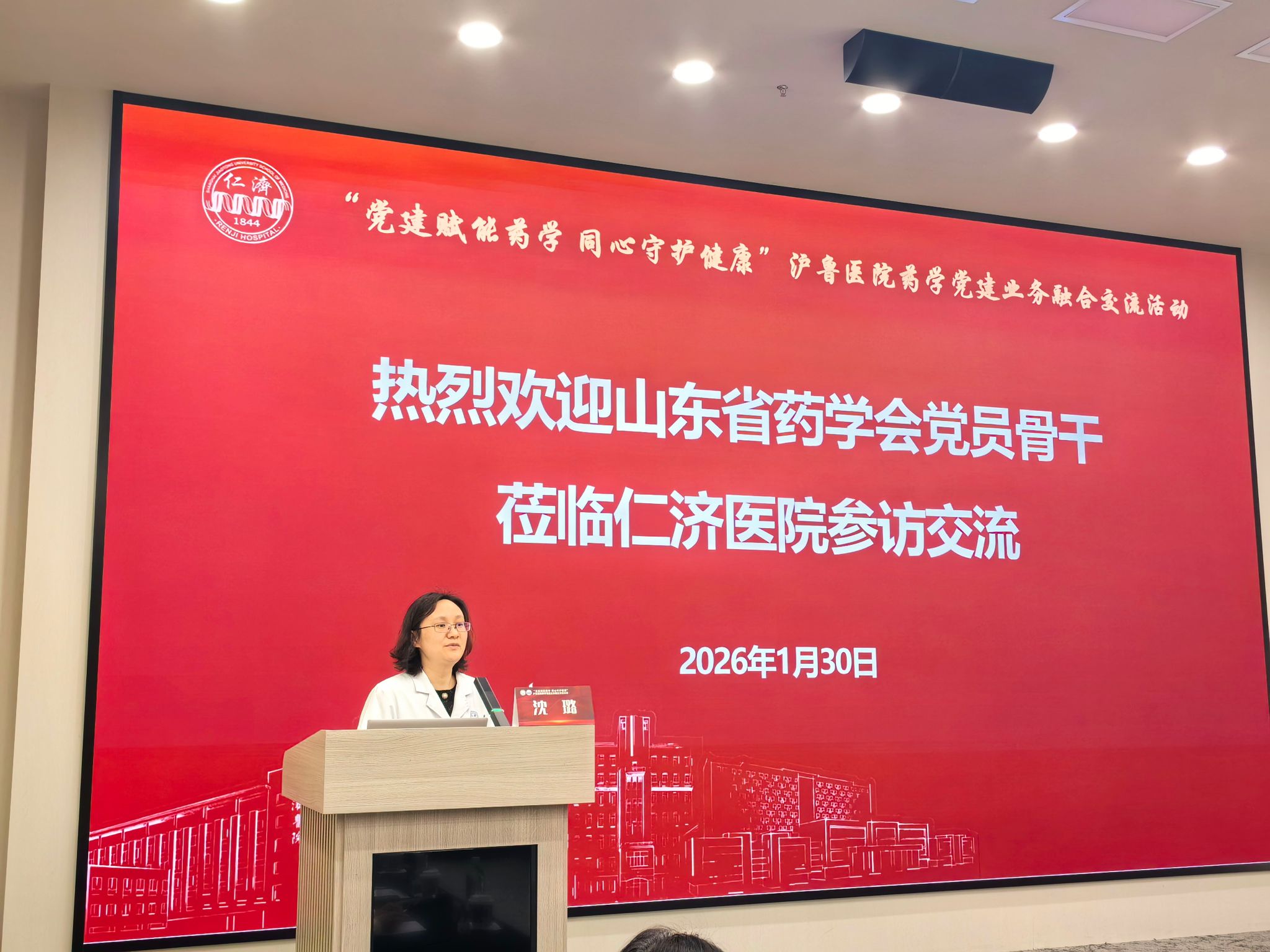冬雨润申城,贤聚话发展。2026年1月30日,“党建赋能药学,同心守护健康”沪鲁医院药学党建与业务融合交流活动在上海交通大学医学院附属仁济医院8号楼隆重举行。山东省药学会带领11家大型公立医院的药学部党员骨干一行17人,与仁济医院党委书记牟姗,药学部主任、党支部书记林厚文及药学部党员骨干齐聚一堂,共谋党建引领下药学高质量发展的新路径。会议由仁济医院党办主任沈璐及药学部副主任李肖玲主持。