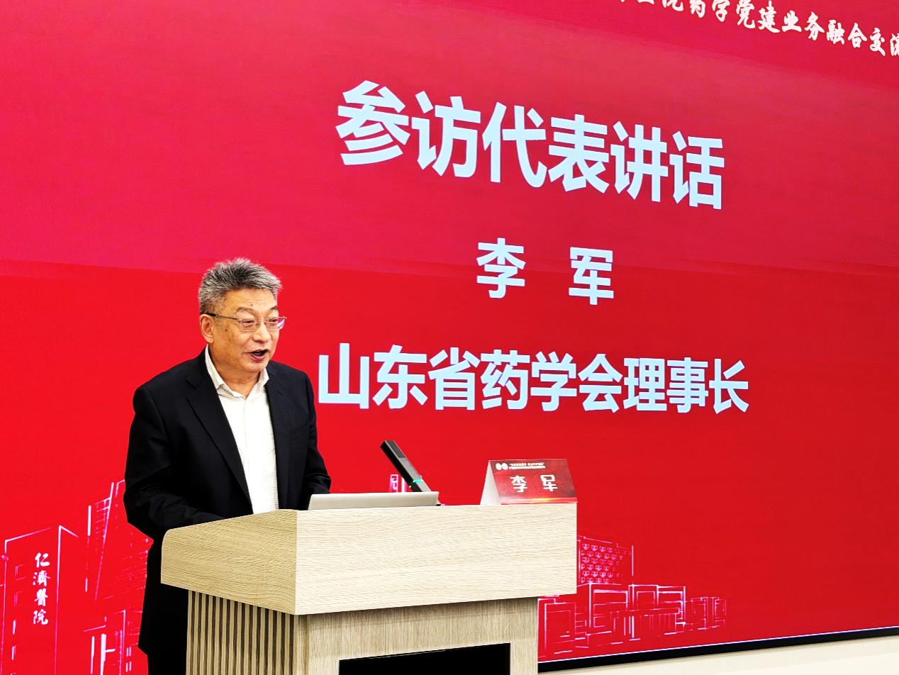 山东省药学会理事长李军代表参访团讲话。他盛赞仁济医院药学部在临床药学服务、智慧药房建设、科研创新及高层次人才培养等方面的标杆作用,并明确提出共建“沪鲁药学协作平台”的构想,希望双方在党建联建、科研协作、人才共育等方面开展实质性合作,携手服务国家健康战略。