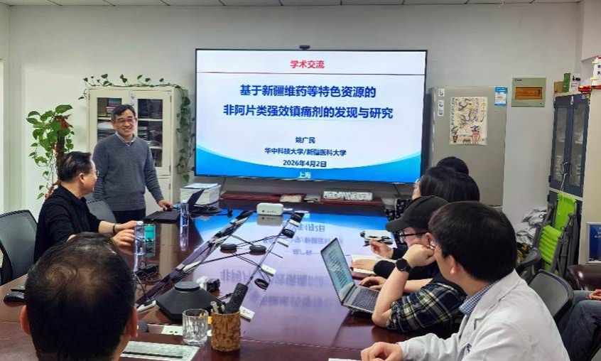 2026年4月2日,华中科技大学/新疆医科大学姚广民教授应邀到访上海交通大学海洋药物融合创新中心,在仁济医院作 “基于新疆维药等特色资源的非阿片类强效镇痛剂的发现与研究”的学术报告。报告由上海交通大学医学院临床药学院院长、上海交通大学海洋药物融合创新中心主任、上海交通大学医学院附属仁济医院药学部主任林厚文教授主持,创新中心科研人员和师生参加交流。