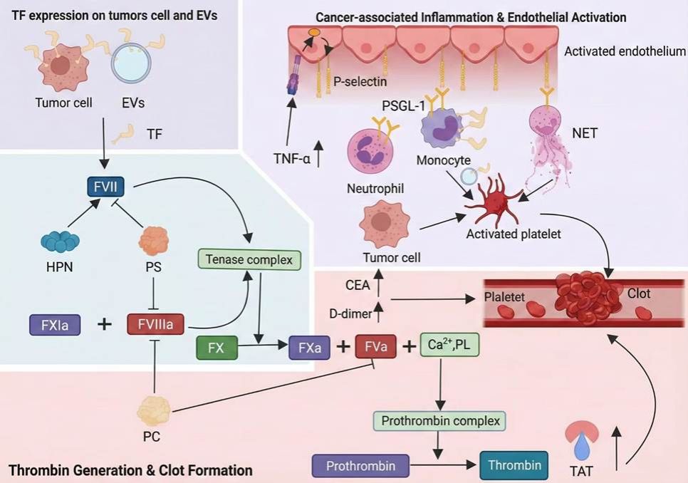 在结直肠癌的发病过程中,多种机制相互交织,共同推高血栓风险。肿瘤细胞常过度表达组织因子(TF)并释放携带TF的微粒,这会直接激活凝血级联反应;慢性炎症导致促炎因子水平升高以及中性粒细胞外捕获网(NETs)的形成,进一步促进血栓形成;肿瘤诱导的内皮功能障碍损害抗凝途径并增强促凝活性;结直肠癌患者还表现出全身性高凝状态,其特征为凝血因子水平升高、纤溶活性降低以及天然抗凝剂水平减少;治疗干预措施,尤其是外科手术,会通过造成血管损伤和刺激内皮细胞活化进一步增加血栓形成的风险。该综述全面梳理了与结直肠癌相关VTE的预测性生物标志物。