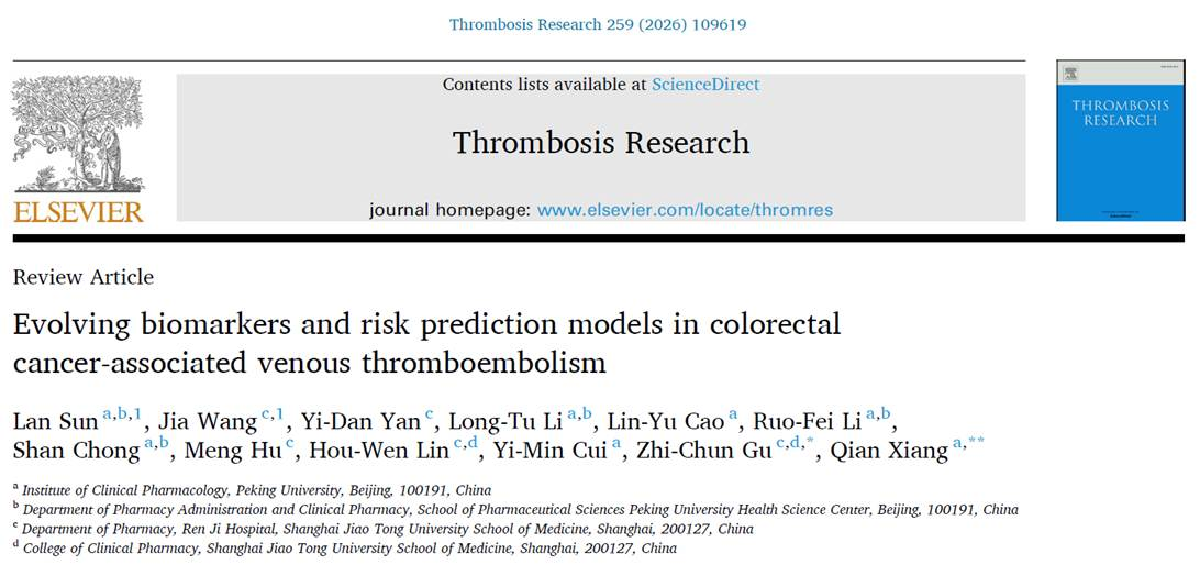 VTE是结直肠癌患者第二大死亡原因,发生率高达8-15%。血栓事件不仅显著增加患者的死亡风险,还严重影响肿瘤治疗的连续性和生活质量。然而,目前的临床实践中,如何精准识别高危人群、如何平衡抗凝治疗的获益与出血风险仍是重大挑战。上海交通大学医学院临床药学院林厚文、顾智淳、王佳团队联合北京大学临床药理研究所的崔一民、向倩、孙澜团队在国际期刊《Thrombosis Research》上发表题为“Evolving biomarkers and risk prediction models in colorectal cancer-associated venous thromboembolism”(结直肠癌相关静脉血栓栓塞的生物标志物和风险预测模型进展)的综述论文。该文系统梳理了结直肠癌相关静脉血栓栓塞症(VTE)的生物标志物研究前沿,并深入探讨了风险预测模型的优化路径,为临床精准预防提供了新思路。