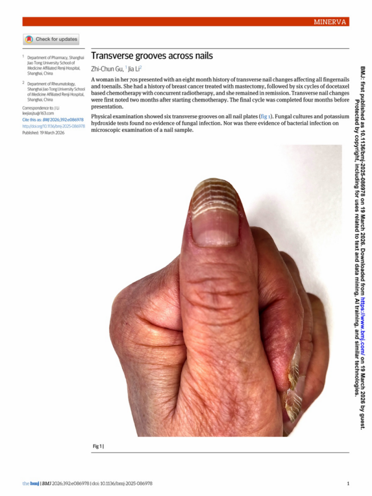 近日,《英国医学杂志》(The BMJ)在线发表了上海交通大学医学院附属仁济医院药学部顾智淳主任药师与风湿免疫科李佳副主任医师合作的一篇临床案例。该案例以“Transverse grooves across nails”(指甲横向沟纹)为题,展示了一种由化疗药物引起的罕见不良反应——博氏线(Beau's lines),为临床识别药物不良反应提供了教科书式病例。