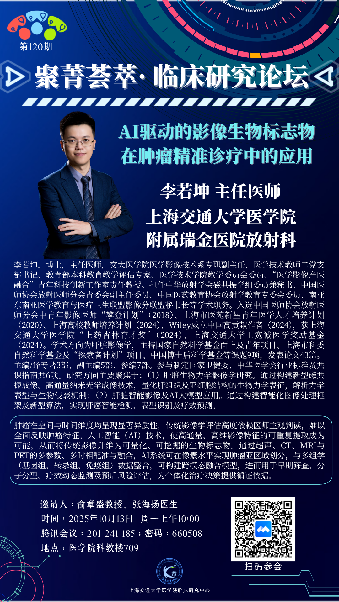 2025年10月13日,来自附属瑞金医院放射科的主任医师李若坤将莅临临床研究中心并做题为“AI驱动的影像生物标志物在肿瘤精准诊疗中的应用”的讲座。