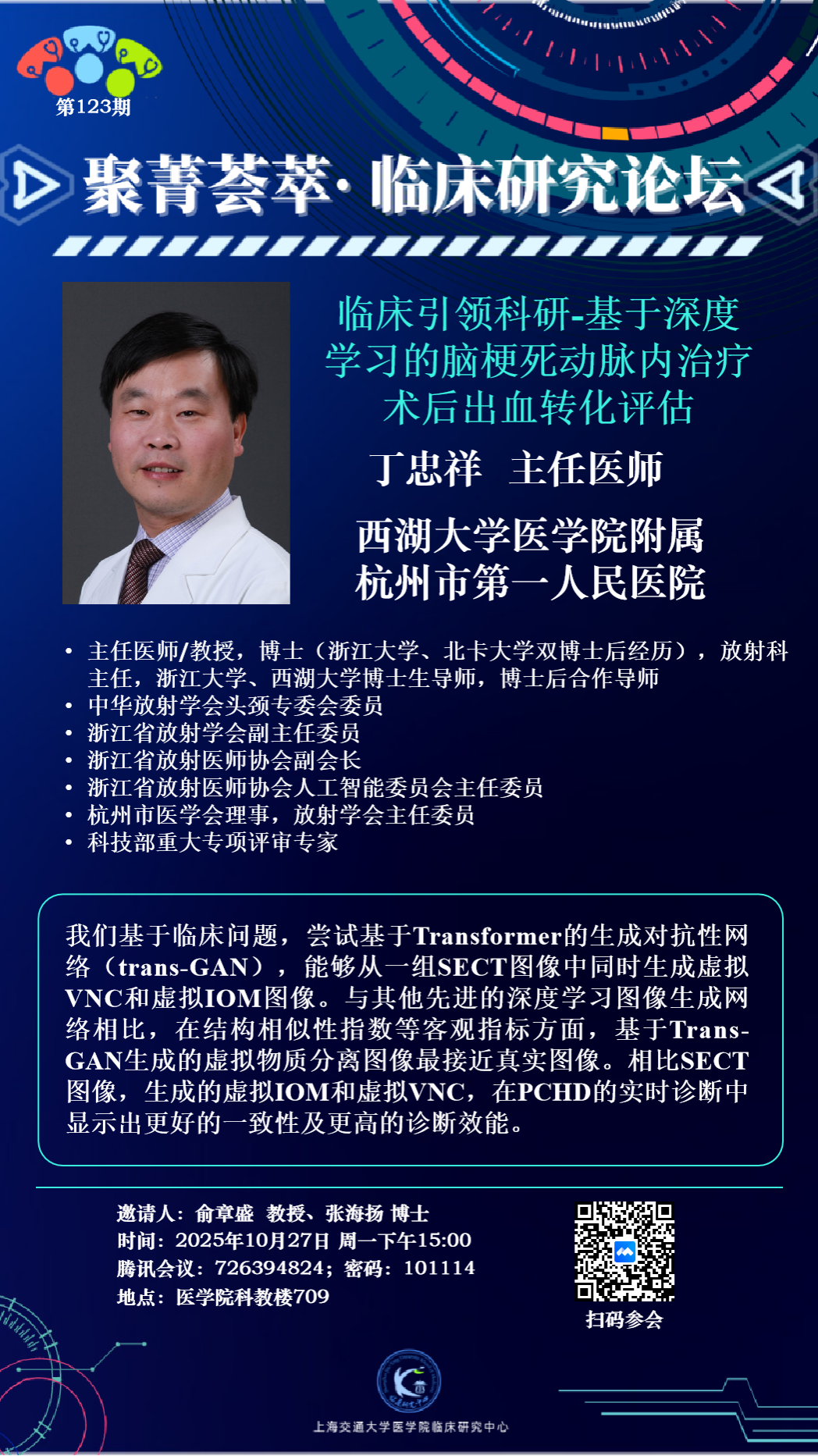 10月27日,西湖大学医学院附属杭州市第一人民医院丁忠祥主任医师将莅临指导并做题为“临床引领科研——基于深度学习的脑梗死动脉内治疗术后出血转化评估”的报告。