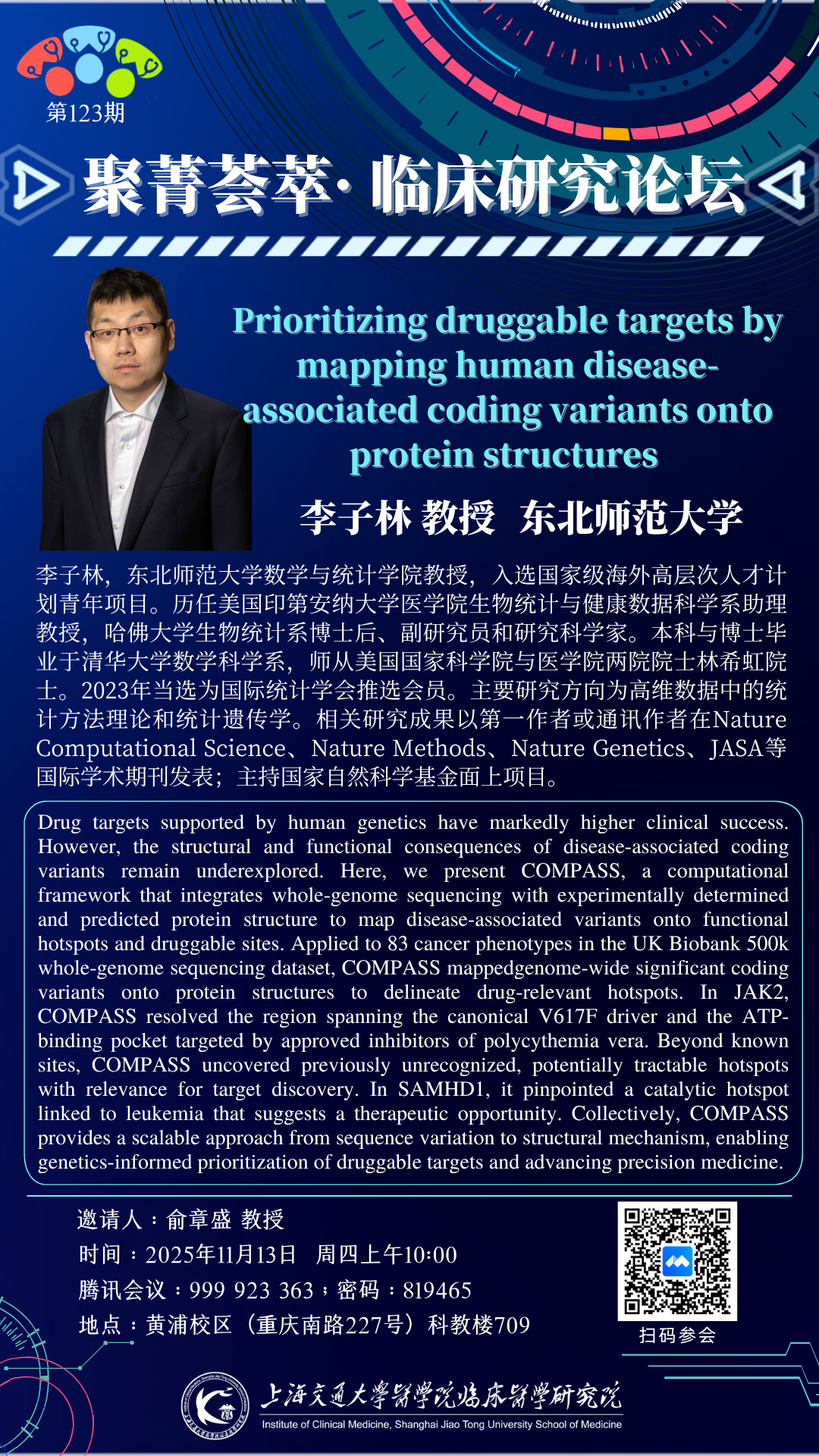 2025年11月13日,东北师范大学李子林教授将莅临上海交通大学医学院临床医学研究院并做题为“Prioritizing druggable targets by mapping human disease-associated coding variants onto protein structures”的报告。