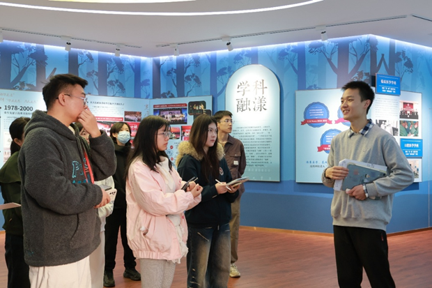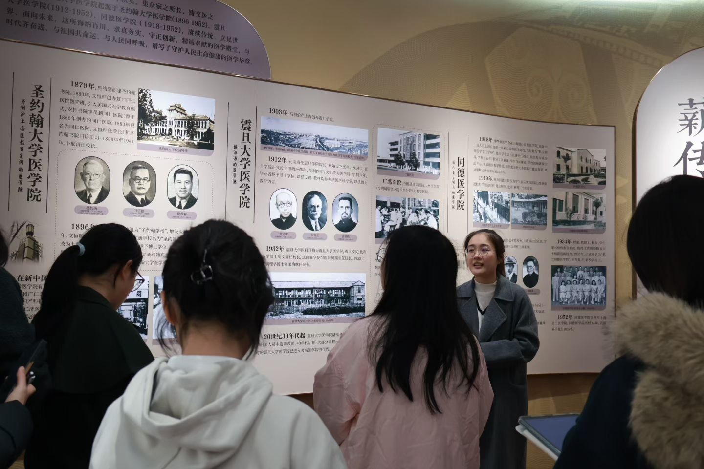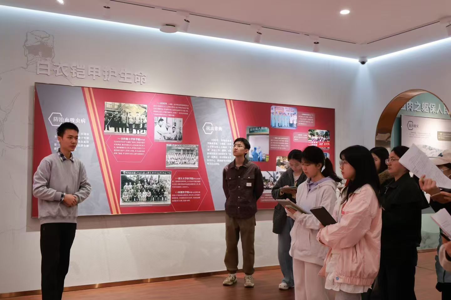 培训伊始,首席讲解员陈宸以院史馆 “源远流长”“薪火相传”“医术济世”“交医首创” 等核心展区为脉络,展开示范讲解。从“老三校”各具特色的历史积淀,到如今医学院全面跨越的综合建设;从一代代医学前辈守正创新、敢为人先的精神品格,到医学院在医学教育、医疗服务与科研领域的斐然成就,陈宸以清晰的逻辑、生动的语言、自然的互动,完整呈现了高质量讲解的范例,为新队员们树立了鲜活榜样。