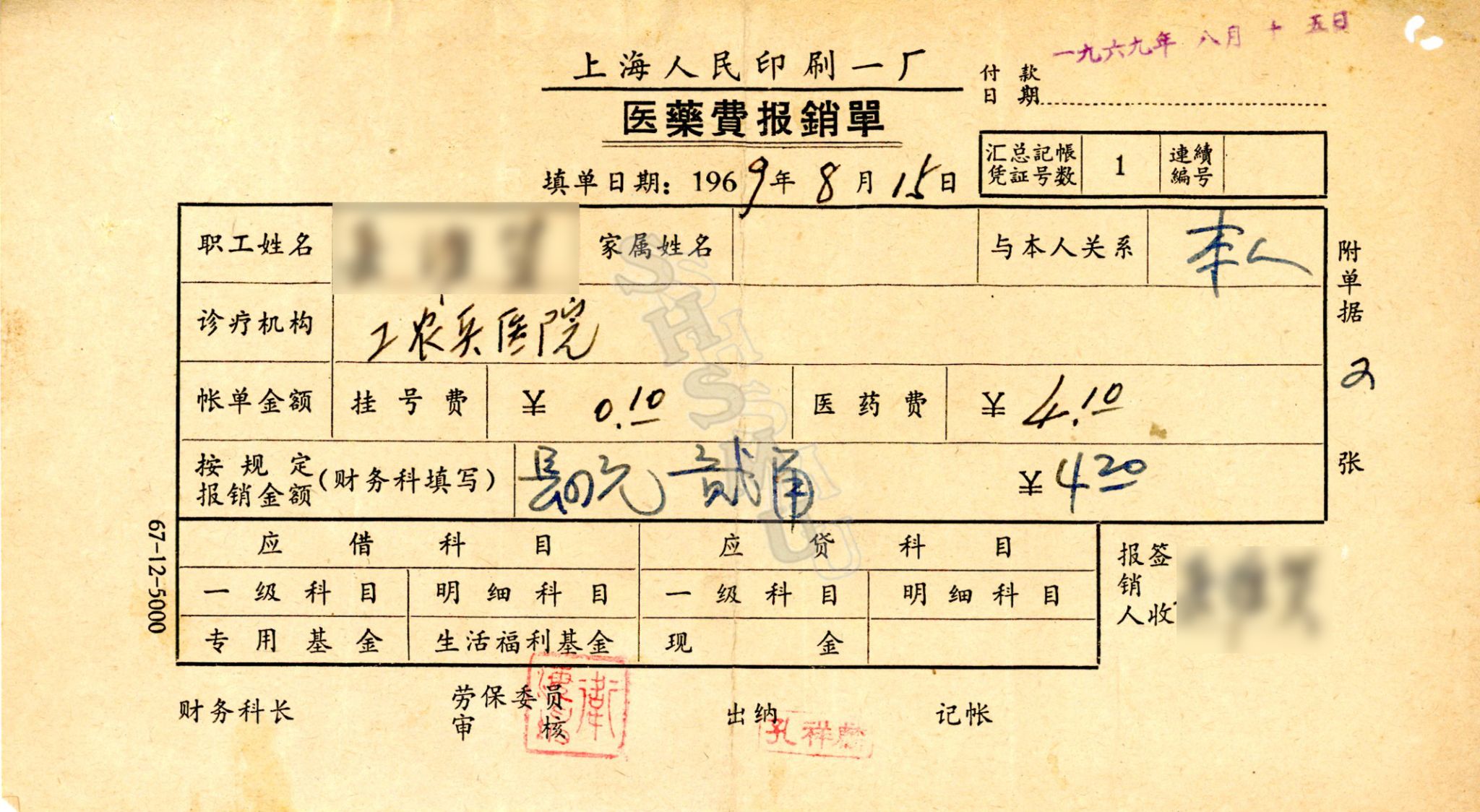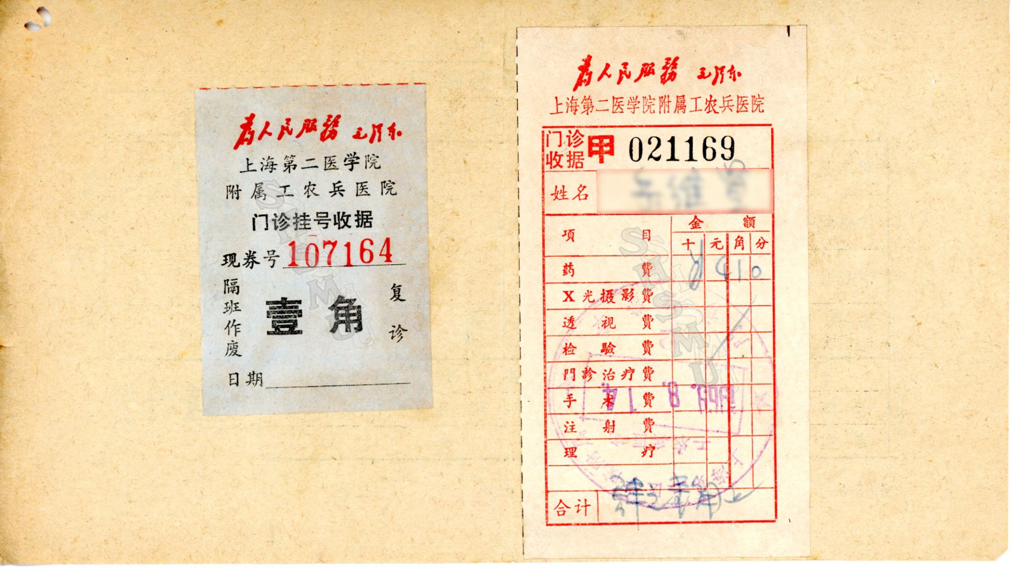 近期,上海市收藏家罗东平先生向上海交大医学院档案馆捐赠了一张1969年上海人民印刷一厂职工的医药费报销单,在这张报销单的背面贴有“上海第二医学院附属工农兵医院”(以下简称“工农兵医院”)的门诊挂号收据和门诊医药费收据。
