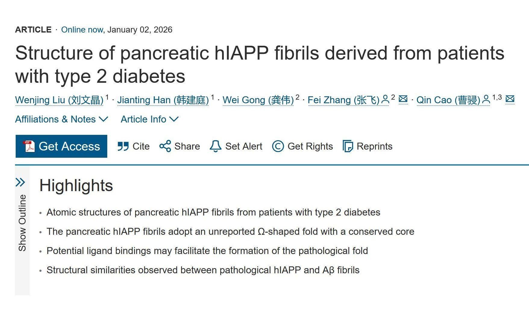 January 4, 2026On January 3, 2026 (Beijing time), a research team led by Zhang Fei from Xinhua Hospital, Shanghai Jiao Tong University School of Medicine (SJTUSM), in collaboration with the team of Cao Qin from the Bio-X Institutes of Shanghai Jiao Tong University, published an online research article in Cell entitled “Structure of pancreatic hIAPP fibrils derived from patients with type 2 diabetes.”This st... -