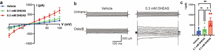 Structural insights and hypotheses alone are not sufficient; the team therefore conducted dynamic experiments to validate the transport process. For the first time, exploiting the charged nature of bile acid derivatives, they used whole-cell patch-clamp electrophysiology to directly record membrane potential–dependent transmembrane currents triggered by substrate (DHEAS) application in cells expressing Ostα/β (Fig. 3). This approach converts bile acid transport into a measurable electrical signal, enabling real-time and controlled observation. The experiments confirmed that Ostα/β functions as a facilitated diffusion transporter whose transport direction is not fixed, but instead determined by the electrochemical gradients of the substrate across the membrane. Specifically, membrane potential acts as a key regulatory factor that biases the transport direction: depolarization favors substrate influx, whereas hyperpolarization promotes efflux. Thus, membrane potential is not merely a passive background parameter, but a decisive factor that biases bidirectional transport, enabling Ostα/β to preferentially mediate bile acid efflux under different physiological conditions.