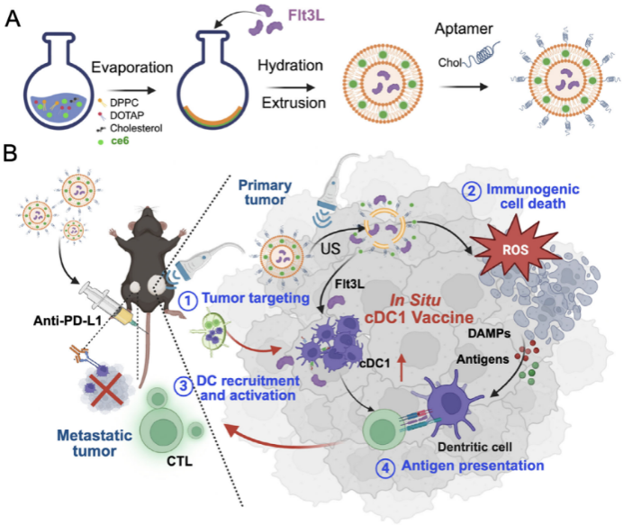 Prostate cancer is the most common malignancy of the male genitourinary system and the second leading cause of cancer-related death among men in developed countries. The 5-year survival rate for patients with advanced disease remains approximately 30%. As a typical“cold tumor,” prostate cancer is characterized by low immunogenicity, a highly immunosuppressive tumor microenvironment, and a marked reduction in both the number and function of conventional type 1 dendritic cells (cDC1), which are essential for antigen presentation. These factors severely limit the efficacy of immunotherapies such as immune checkpoint blockade (ICB), posing a major clinical challenge. Currently approved dendritic cell vaccines require ex vivo manipulation of autologous DCs and are associated with limitations, including a restricted antigen repertoire, complex preparation procedures, and rapid functional decline after reinfusion, thereby limiting their clinical applicability. Therefore, developing novel therapeutic strategiesthat can remodel the tumor immune microenvironment and efficiently activate endogenous antitumor immunity has become a key focus in prostate cancer immunotherapy. The Apt-Flt3L@Lipo platform designed by the research team is prepared through a three-step process involving thin-film hydration, extrusion, and EpCAM aptamer conjugation, enabling precise targeting of prostate tumor tissue via intravenous administration. Upon ultrasound activation, Ce6 induces immunogenic cell death (ICD) in tumor cells,thereby releasing abundant patient-specific tumor antigens. Meanwhile, Flt3L promotes the differentiation and intratumoral recruitment of cDC1 within the tumor microenvironment, achieving precise coupling of antigen release and cDC1 activation. This strategy provides a novel approachto precision immunotherapy in prostate cancer and establishes a theoretical foundation for extending immunotherapy to other low-immunogenic solid tumors, demonstrating strong clinical translation potential.