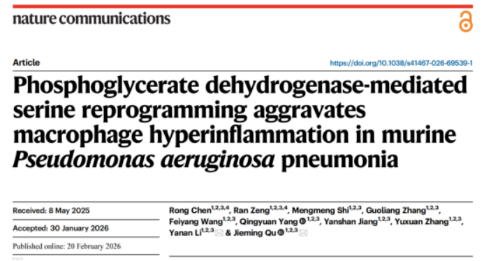 Recently, the team led by Professor Qu Jieming from the Department of Respiratory and Critical Care Medicine at Ruijin Hospital, an affiliated hospital of Shanghai Jiao Tong University School of Medicine, published a paper titled “Phosphoglycerate Dehydrogenase-Mediated Serine Reprogramming Aggravates Macrophage Hyperinflammation in Murine Pseudomonas aeruginosa Pneumonia” inNature Communications. The paper explores how PHGDH-mediated serine metabolic reprogramming exacerbates excessive macrophage inflammation in the lungs of mice infected with Pseudomonas aeruginosa. Professor Qu Jieming and Associate Researcher Li Yanan are co-corresponding authors of the paper, with Doctoral Students Chen Rong and Zeng Ran serving as co-first authors.