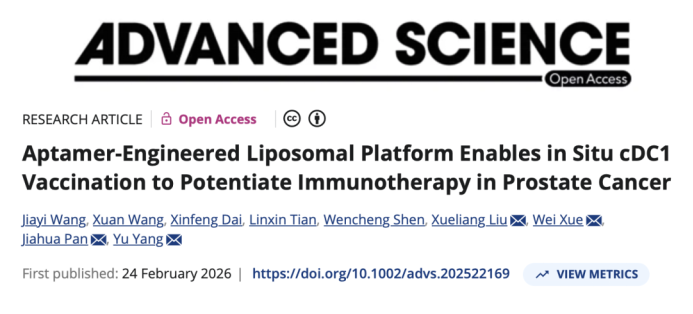Recently, the multidisciplinary team led by Professors Xue Wei and Pan Jiahua from the Department of Urology at Renji Hospital, an affiliated hospital of SJTUSM,published their latest research on prostate cancer immunotherapy in the internationally renowned journalAdvanced Science. The team successfully developed an aptamer-functionalized liposomal delivery platform (Apt-Flt3L@Lipo) that enables targeted co-delivery of FMS-like tyrosine kinase 3 ligand (Flt3L) and chlorin e6 (Ce6). This approach innovatively enables the in situ generation of a cDC1 vaccine, opening a new avenue for the treatment of low-immunogenic prostate cancer.