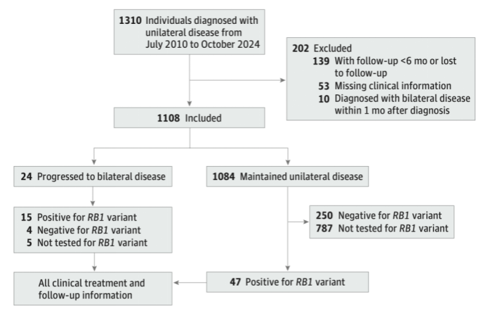 Further analysis showed that peripheral blood RB1 gene testing results were closely associated with the risk of bilateral conversion: the 24-month cumulative incidence in RB1 gene-positive children was 24.8%, significantly higher than the 1.6% in RB1 gene-negative children. Additionally, in RB1 gene-positive children, the age at initial diagnosis was also an important influencing factor. All children who developed bilateral disease were diagnosed before 9 months of age, while no bilateral conversion was observed in children diagnosed at 9 months or older. The study suggests that combining RB1 gene testing with the age at initial diagnosis can more effectively identify high-risk children and provide valuable guidance for follow-up planning, long-term management, and genetic counseling.