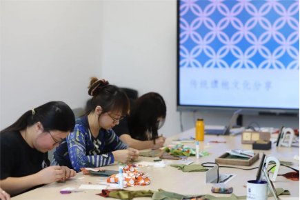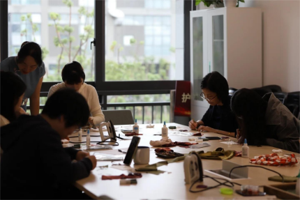 随后,活动进入手工体验环节。盘扣作为旗袍上不可或缺的经典元素,源于自然中的花鸟鱼虫,寄托着人们对美好生活的向往与祝福。在指导老师的带领下,大家从秋日自然中汲取灵感,一点一滴慢慢编织出一枚枚精致的盘花扣胸针。现场气氛宁静而专注,老师们在针线交错间,不仅体验了传统手作的乐趣,也感受到非遗技艺的细腻与温度。