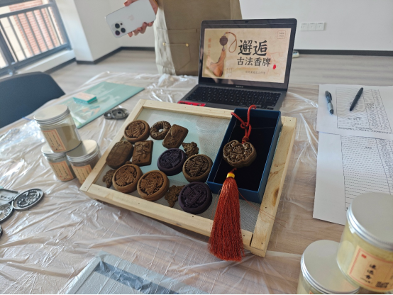 开场讲解阶段,老师简要回溯了中国香文化从春秋祭祀到宋明佩香的历史脉络,介绍沉香、檀香、麝香等常见香材的特性与功用,并重点说明香牌“无需点燃即可散发香气”的特点及其装饰、怡情、养生等作用。随后,老师示范“和香—醒泥—压模—修边—阴干—穿孔”六道工序,提示“少量多次加水”“模具薄刷脱模油”等操作要点,为手作环节奠定扎实基础。