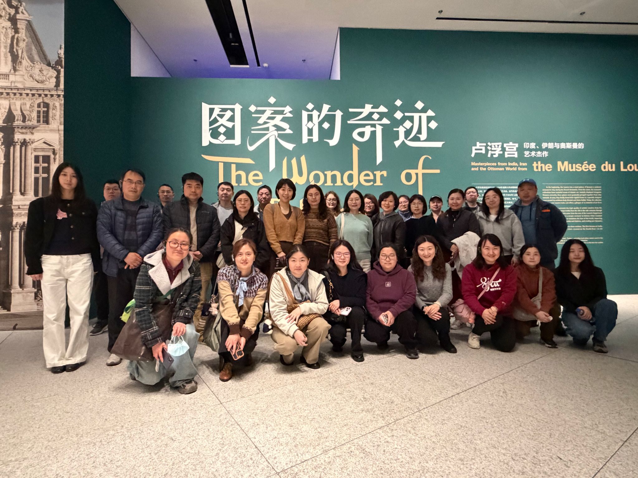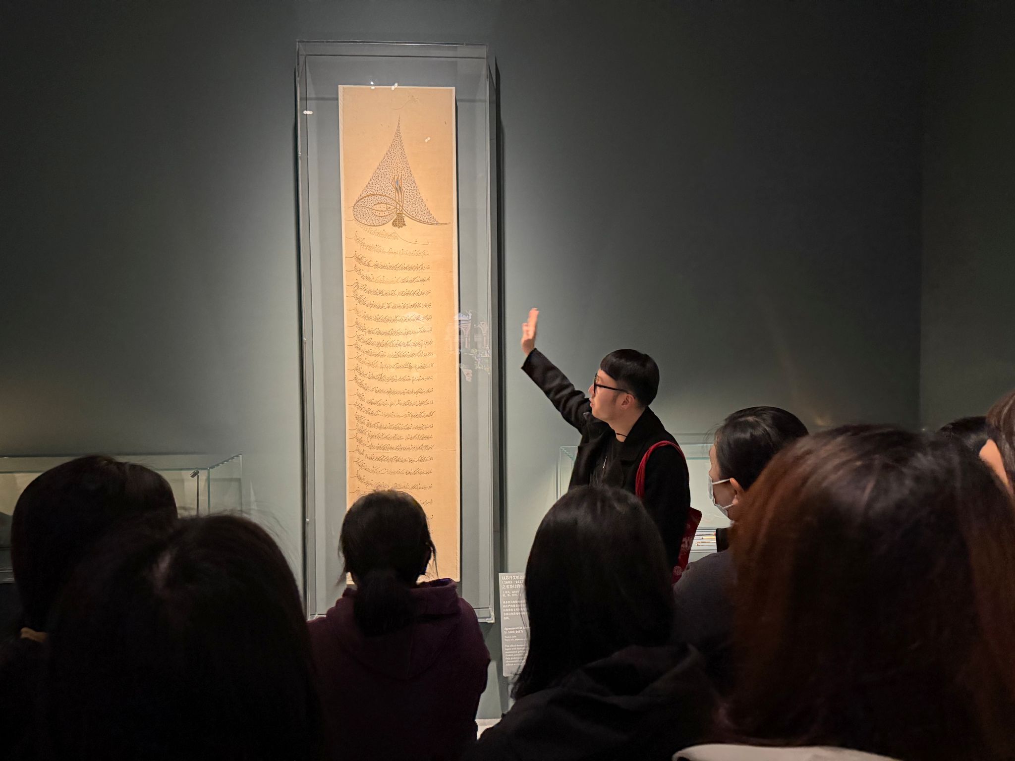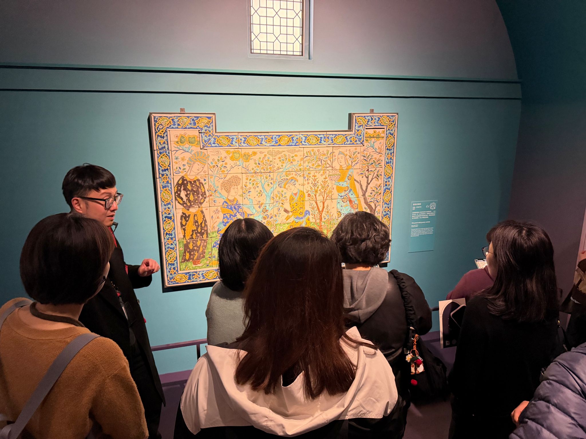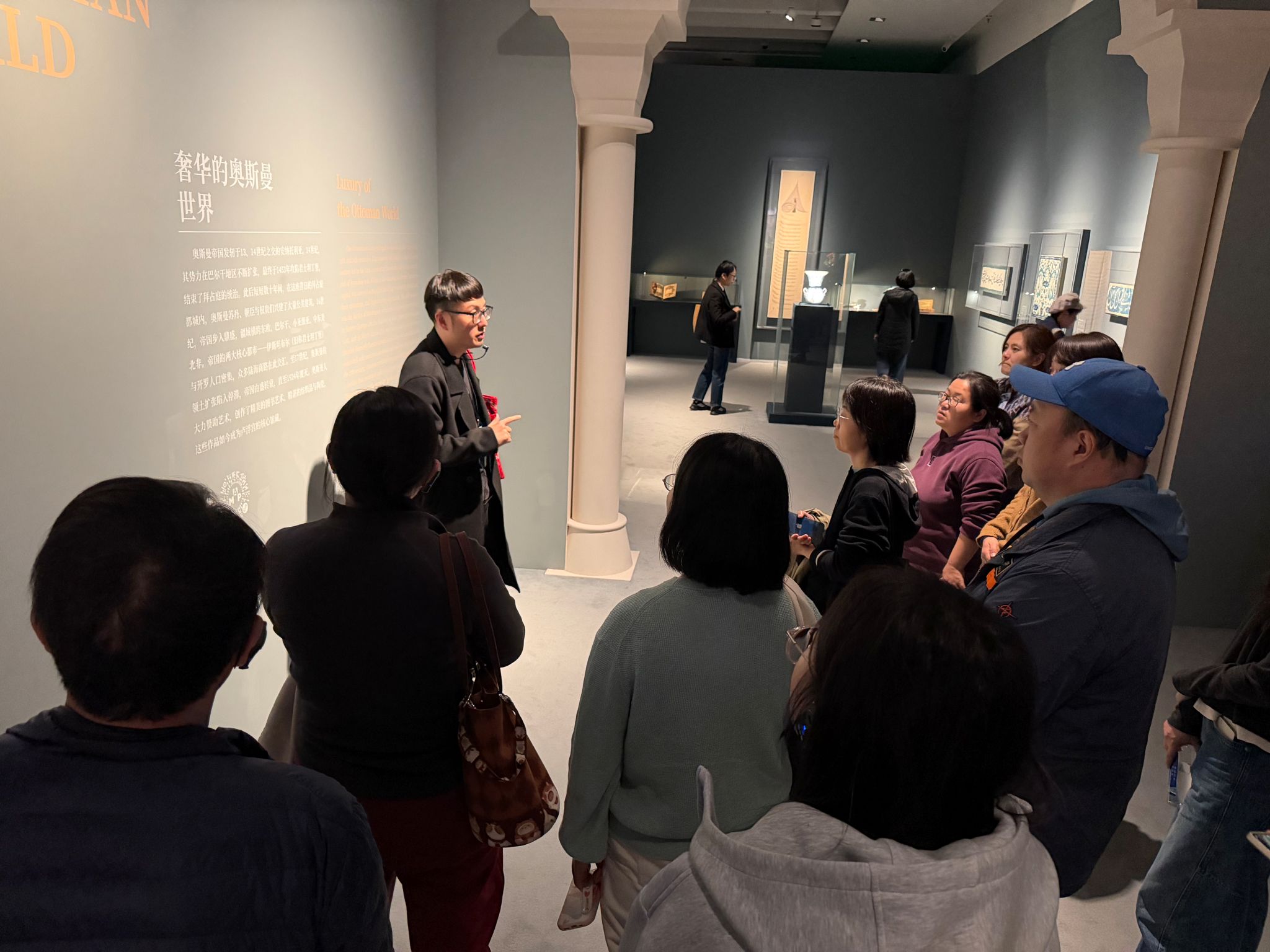 活动伊始,大家在专业讲解员的带领下,参观重磅特展——“图案的奇迹:卢浮宫印度、伊朗与奥斯曼的艺术杰作”。作为卢浮宫在国内规模最大的上海首展,此次展出汇聚约300件16至19世纪馆藏珍品,涵盖陶瓷、珠宝、玉石、织毯、书法等多种门类。从莫卧儿帝国的玉石雕刻到萨法维王朝的釉面陶板,从奥斯曼宫廷的书法手稿到跨文明交融的龙纹瓶,大家跟随讲解深入浅出地了解到图案背后的文化密码与历史脉络。驻足凝视,在几何纹样与诗歌意象的交织中,大家领略了南亚、西亚与欧洲文明的碰撞与融合,感受不同地域艺术风格的独特魅力。