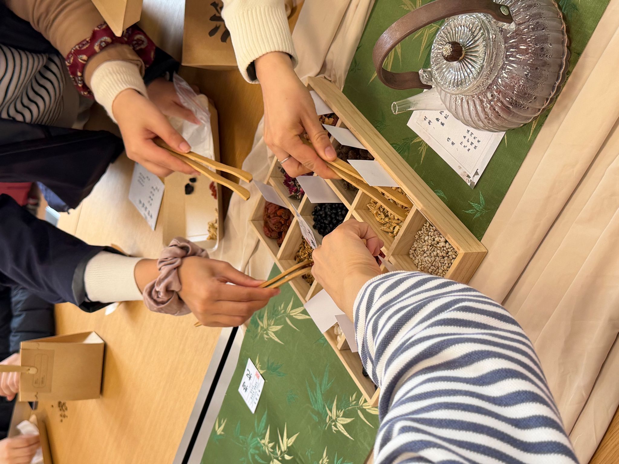 手作DIY环节,现场整齐摆放着各类天然养生材料,教职工们兴致盎然,结合自身体质与口味偏好,精心挑选搭配、称重分装、封装茶包,亲手制作专属养生茶包。大家互相交流配方、分享心得,指尖流转间,一个个精致茶包诞生,成就感满满。