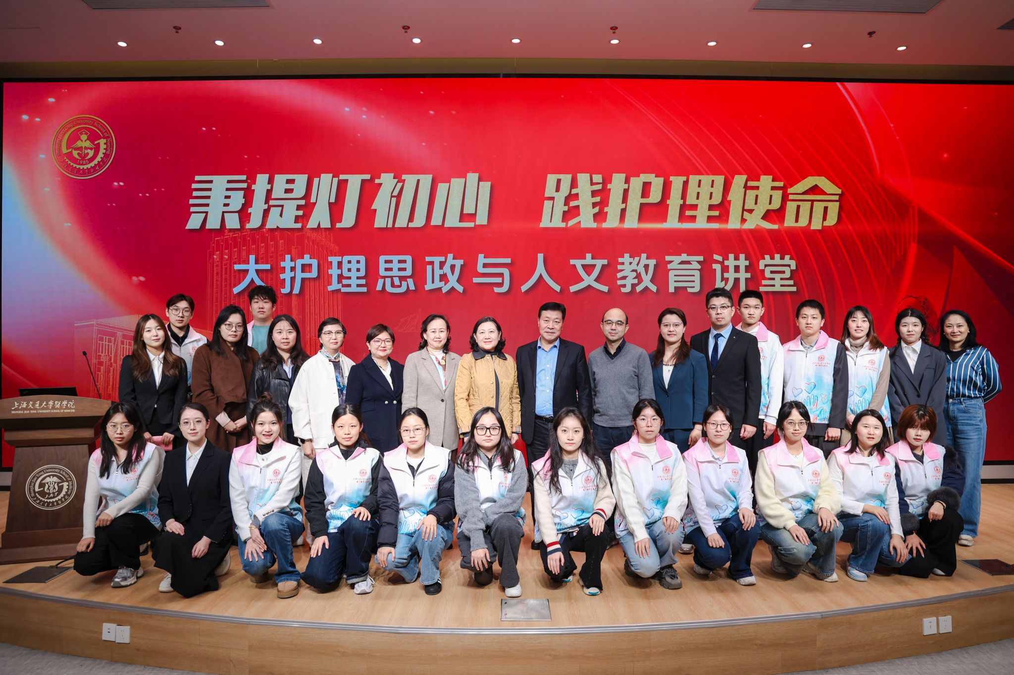 初冬时节,彤程大讲堂暖意融融。11月18日,上海交通大学护理学院“大护理思政与人文教育讲堂”第一讲正式开讲,汇聚行业楷模与师生代表,共同开启一场融合思政引领、人文滋养与专业传承的精彩盛宴。上海交通大学医学院副院长方勇、学生工作指导委员会秘书长郁松、护理学院党委书记方琼,第50届南丁格尔奖获得者邢红,以及四位2025年“上海好护士”获得者袁勇勇、宋燕、杨悦来、王子辰出席活动,护理学院全体教师、本科生及研究生共同参与。本次活动由2024级护理本科生李佩融担任主持。