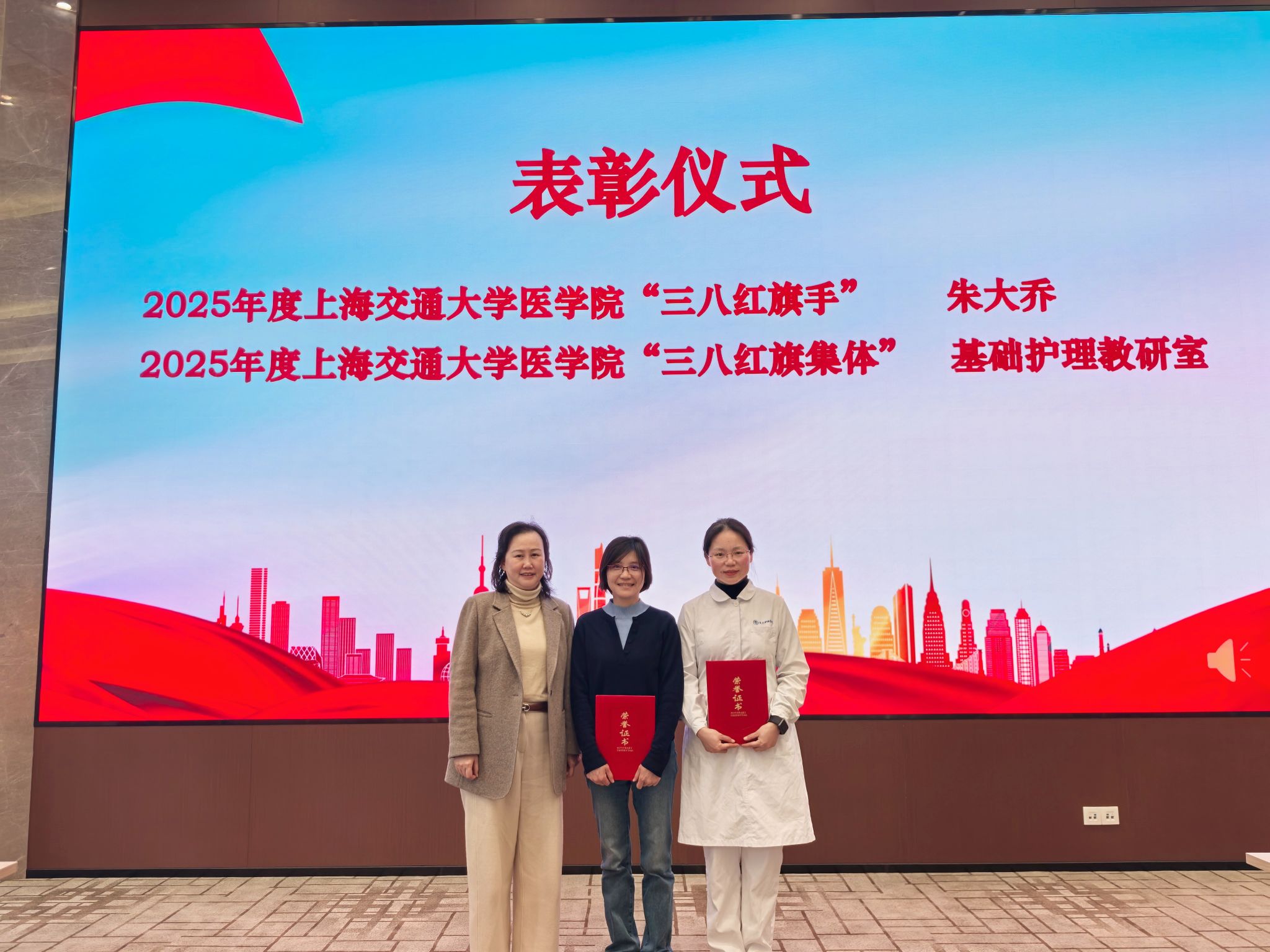 学院党委书记方琼为2025年度上海交通大学医学院“三八红旗手”朱大乔、“三八红旗集体”基础护理教研室颁奖。一份份荣誉,既是对先进集体与个人过往工作的肯定与褒奖,更激励着全院教职工以榜样为标杆,锐意进取、争先创优。