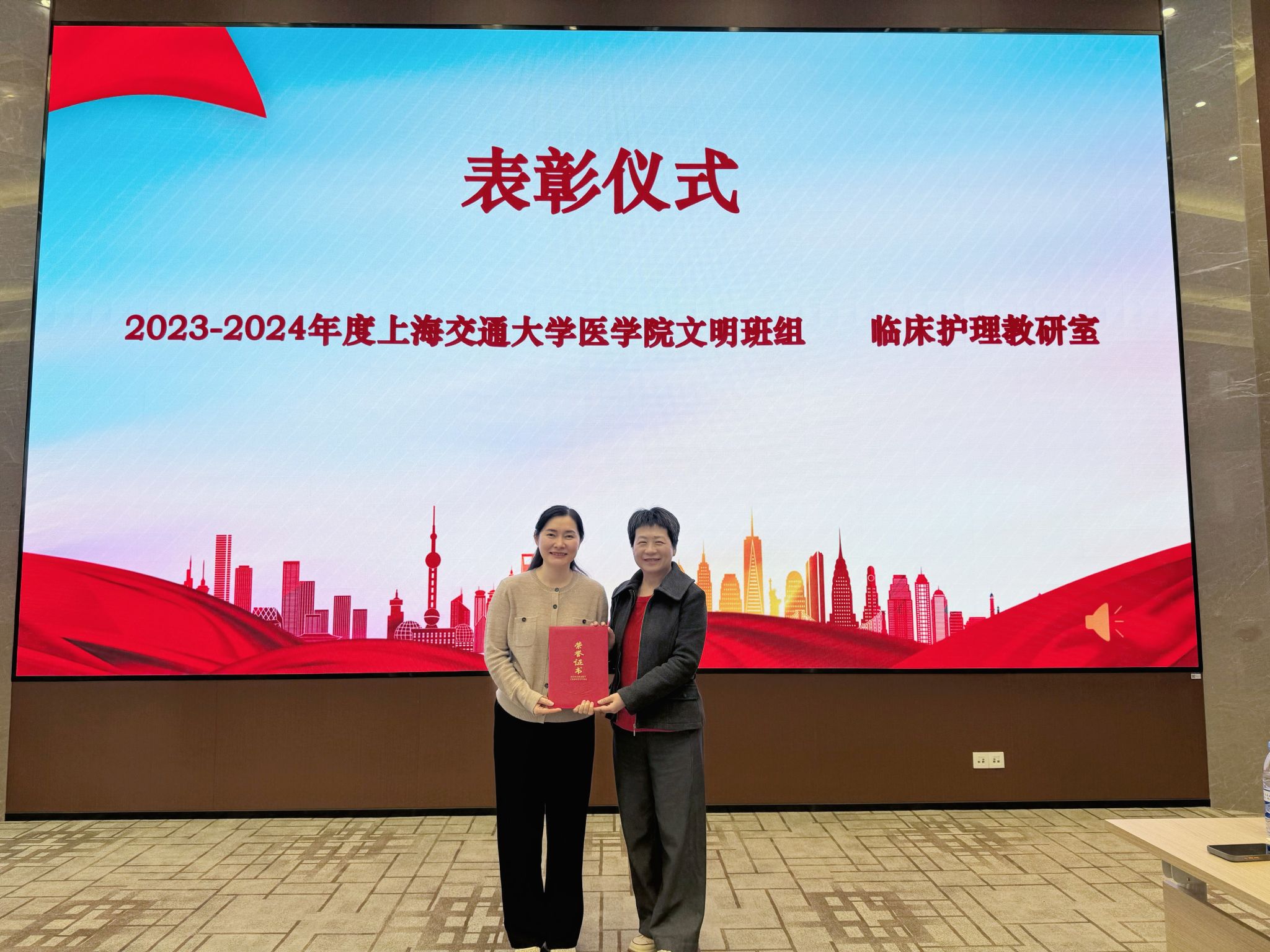榜样引领前行,先进凝聚力量。会上举行表彰仪式,学院院长李敏为荣获上海交通大学医学院2023-2024年度“文明班组”的临床护理教研室颁奖。
