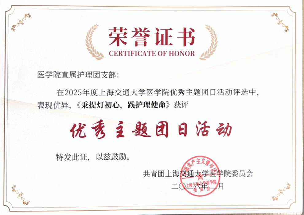 2026年2月上海交通大学医学院团委公布主题团日活动评选结果,我院“秉提灯初心,践护理使命”主题团日活动凭借扎实的组织实施、鲜明的专业特色与显著的活动成效,成功获评“优秀主题团日活动”。