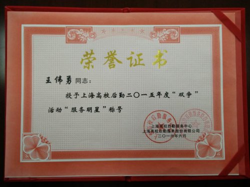 “服务明星”荣誉证书 王伟勇是后勤科教楼物业主任,担负着学院行政楼宇一年365天的接待和运行工作。作为一名服务工作者,他始终坚信要做好工作就要做个有“心”人,何谓有“心”呢?一是耐心:他自学大型特种设备和会务设备的维修保养知识,熟练掌握设备操控技能;他回访服务对象,耐心听取接受各方意见、建议,掌握会务服务的第一手资料。二是细心:他心思细密,考虑事情周全;为了保证每一次会议顺利召开,会前他总是尽其所能按照与会者要求布置会场,用心调试设备,检查运行状况,做到服务到位、责任到位。三是决心:会务工作需要无私奉献服务大家的决心,工作常常是连轴转,只知道上班,而没有下班,更没有双休日和节假日,但他从不计较个人得失,克服各种困难,顶住疲劳,始终保持良好工作状态,确保每一次会议保障任务都圆满完成。四是恒心:科教楼是学院对外展示形象的重要服务窗口,服务质量好坏直接关系到学院的形象和声誉;他从实际出发,针对不同客户的需求,制定了科教楼服务规范和工作职责。他以身作则,带头践行,用制度来确保将每一件事做好,做到持之以恒。正是因为他在工作中始终坚持这四颗“心”,他的工作多次受到上级表彰和广大师生员工的一致好评,他多次被评为学院年度优秀教工,曾荣获“上海交通大学医学院‘校园新星’称号”和“上海高校后勤2012年度“双争”活动“服务明星”称号。他始终坚信一句话“一根火柴再亮,也只有豆大的光。但倘若用一根火柴去点燃一堆火柴,则会熊熊燃烧”。他无私地把自己所有的技术要领传授给同事们,他用自己的实际行动感召激励着身边的同事们一起为学院的后勤保障事业作奉献,为师生创造美好的明天。