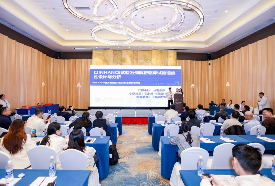 决赛当天,晋级队伍依次登台,围绕项目成果展开答辩,从数据处理逻辑到模型构建思路,再到业务场景的深入解读,充分呈现了各自的分析能力与洞察力。我院参赛团队在王炳顺教授的悉心指导下,由倪长宇、韦思莹、沈英敏3位公卫学院硕士在读研究生组成。团队竞赛的题目聚焦医学临床研究领域,要求以INHANCE临床试验为例,深入解析适应性设计临床试验的设计与分析。面对这一兼具专业深度与技术难度的挑战,我院学子充分发挥在临床研究领域的实战优势,基于对真实案例适应性设计的深刻理解,构建了严谨的统计分析方案,并结合SAS软件实施了先进的数据分析流程,赢得了评委的高度认可,最终取得团队第三名的优异成绩。