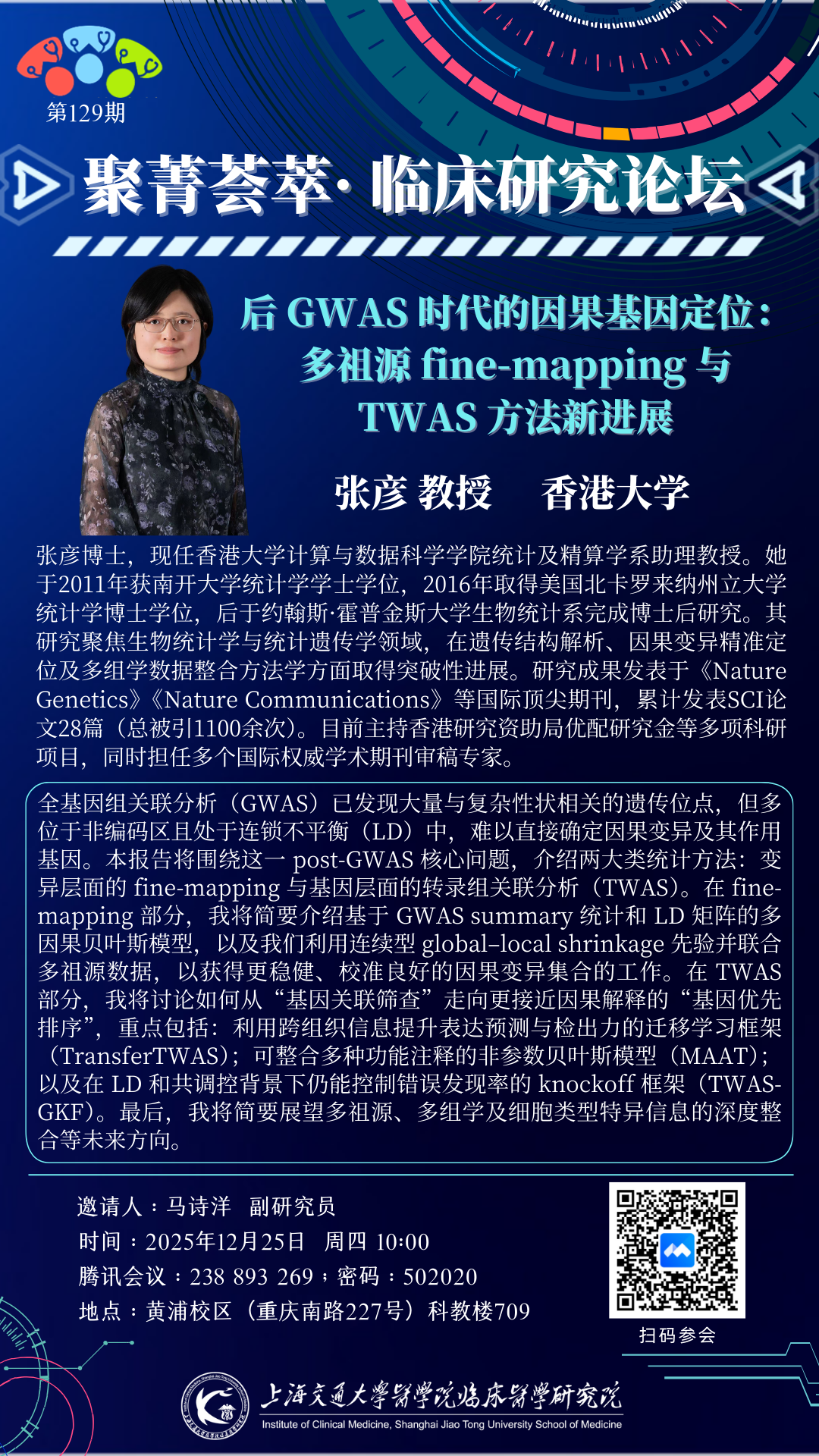 2025年12月25日,香港大学张彦教授将莅临上海交通大学医学院临床医学研究院并做题为“后GWAS时代的因果基因定位:多组源 fine mapping 与 TWAS 方法新进展”的报告。