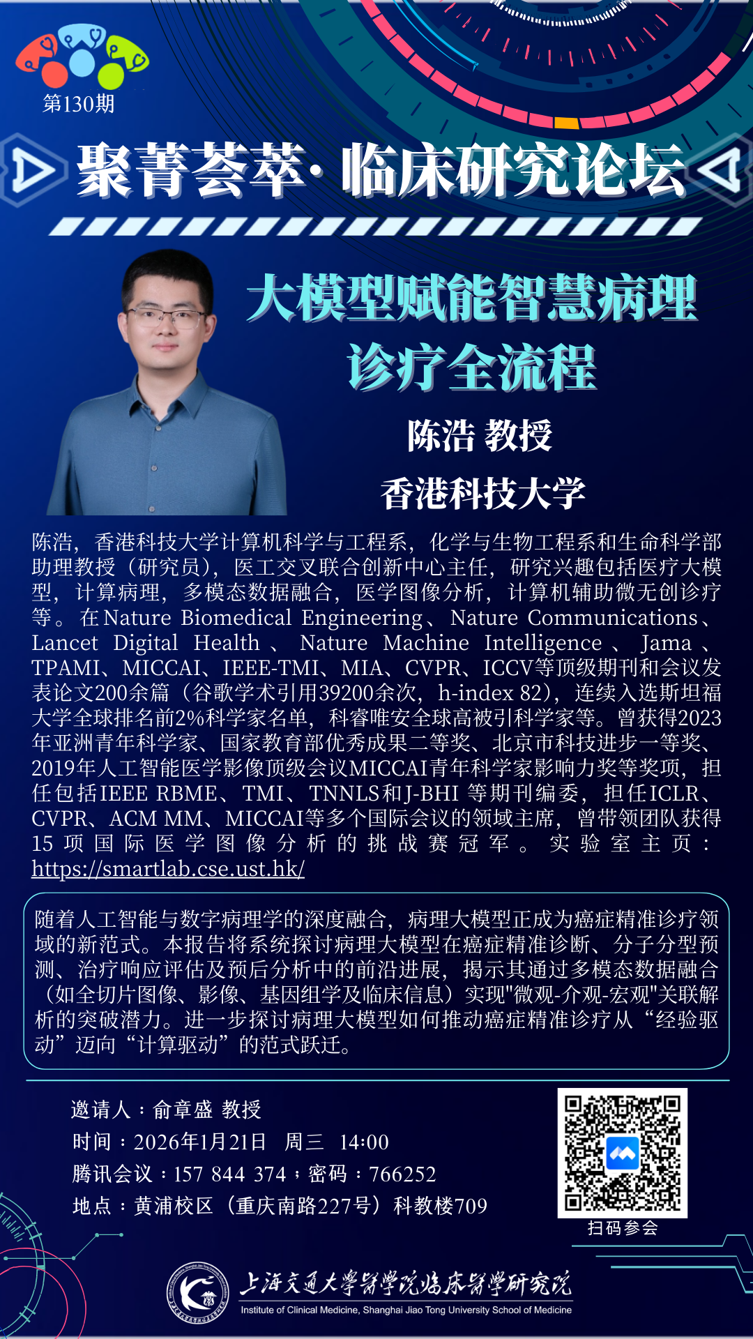 2026年1月21日,香港科技大学陈浩教授应邀莅临上海交通大学医学院临床医学研究院并做题为“大模型赋能智慧病理诊疗全流程”的报告。
