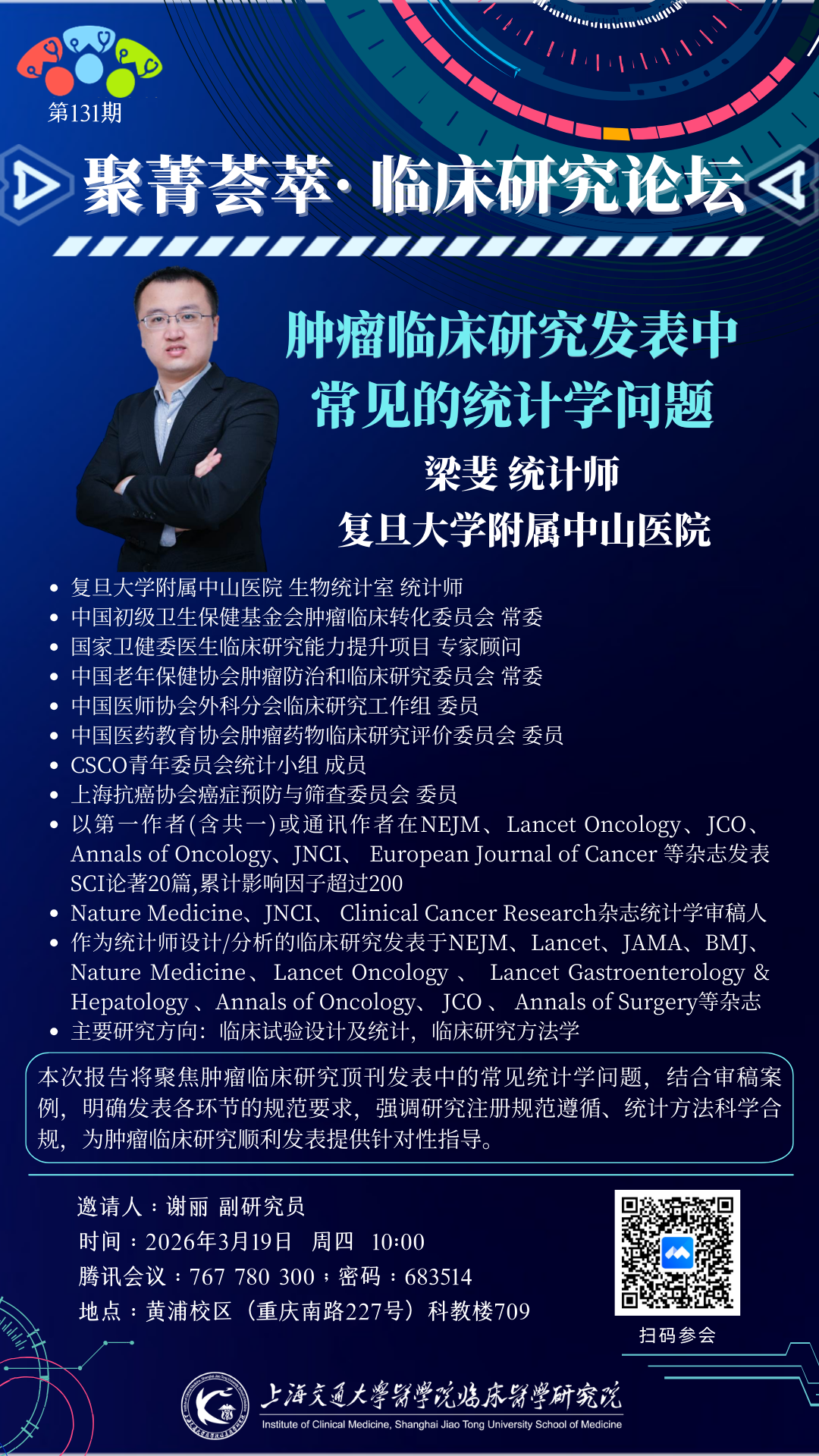 2026年3月19日,来自复旦大学附属中山医院生物统计室的统计师梁斐老师应邀莅临上海交通大学医学院临床医学研究院并做题为“肿瘤临床研究发表中常见的统计学问题”的报告。