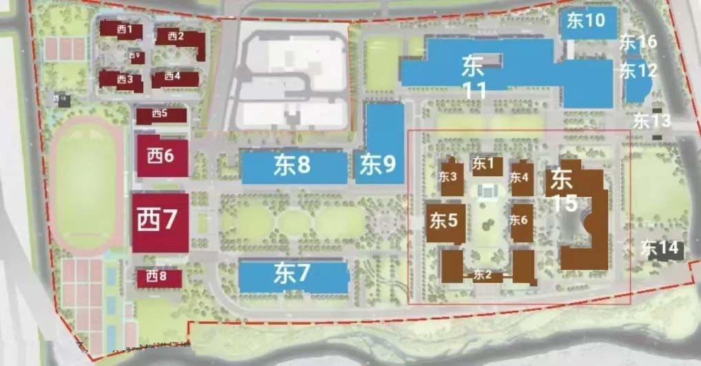 户外场地:标准田径场位于校区西侧;室外篮球场、网球场、排球场等位于校区西南侧;