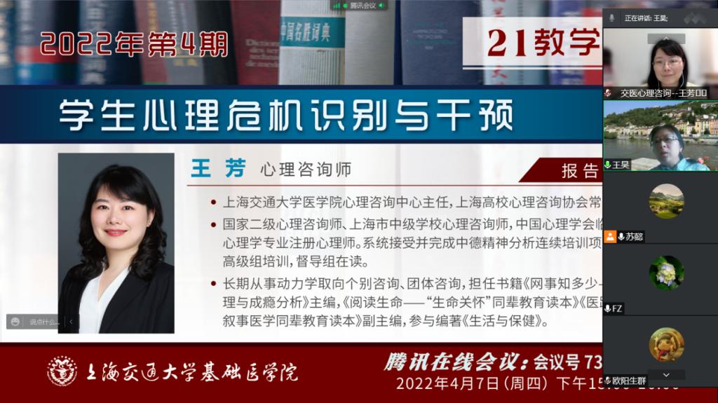 针对可能出现的学生心理危机,4月7日下午,学院又邀请医学院心理咨询中心王芳主任,就心理危机识别与干预对学生工作协同组成员展开培训。王主任介绍了学生普遍存在的典型心理问题,结合实例详细讲解了心理危机类突发事件的基本概念、外在表现、应对方式以及处理流程等内容,为协同组后续工作开展提供思路与方法指导。